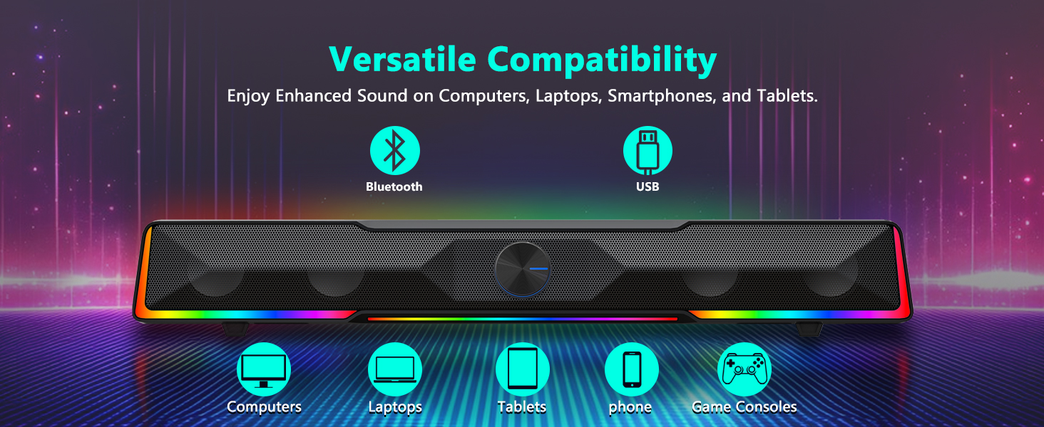 परम्परागत ठूला स्पिकर प्रणालीहरूको विपरीत, यो साउन्डबार-शैली स्पिकर मनिटर वा ल्यापटप स्ट्यान्ड मुनि सफासँग फिट हुन्छ, इमर्सिभ अडियो प्रदर्शन प्रदान गर्दा मूल्यवान डेस्क स्पेस बचत गर्दछ। दुबै ब्लुटुथ र USB वायर्ड जडान विकल्पहरूसँग, ब्ल्याक GS516 ब्लुटुथ/USB वायर्ड जडान साउन्डबार भोल्युम नब कम्प्युटर स्पिकरले डेस्कटप कम्प्युटरहरू, ल्यापटपहरू, ट्याब्लेटहरू र स्मार्टफोनहरू लगायतका यन्त्रहरूको विस्तृत श्रृंखलासँग बहुमुखी अनुकूलता प्रदान गर्दछ।