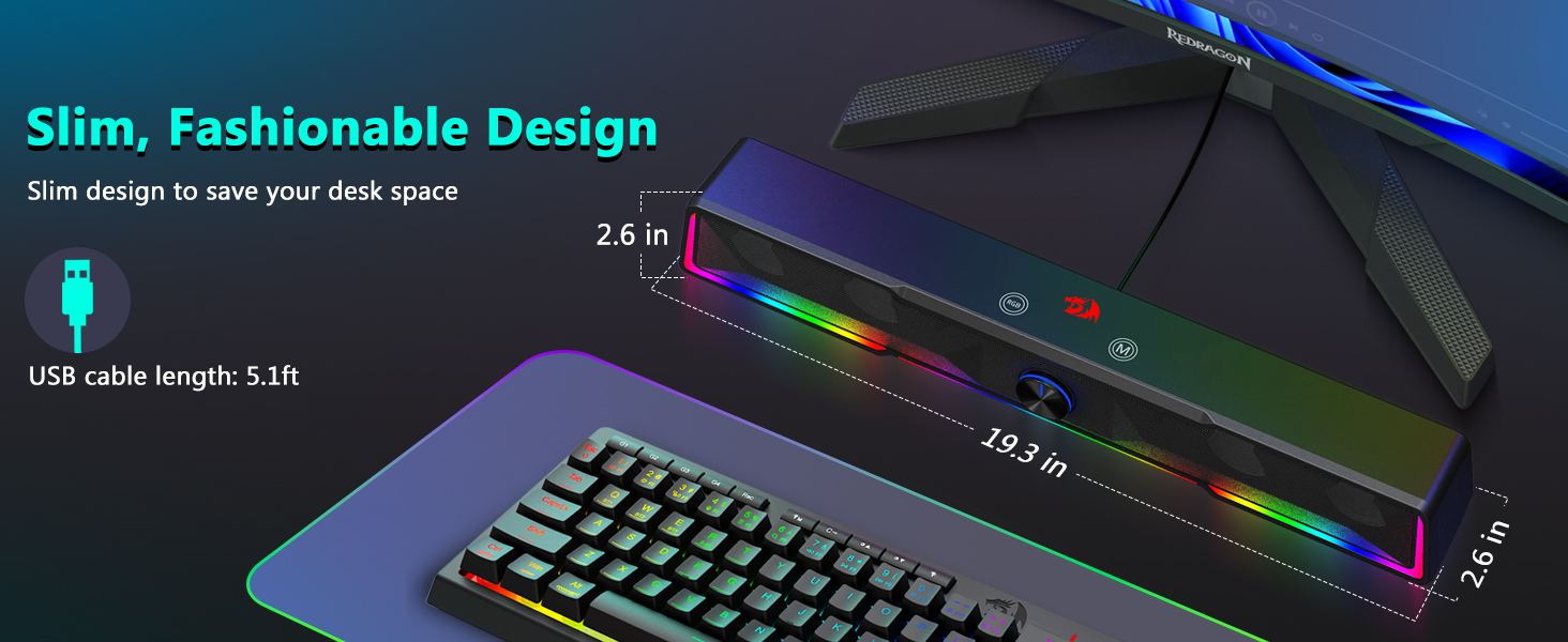 मनिटरको दुबै छेउमा ठूला क्षेत्रहरू ओगटेका परम्परागत स्पिकरहरूको विपरीत, ब्ल्याक GS516 ब्लुटुथ/USB वायर्ड जडान साउन्डबार भोल्युम नब कम्प्युटर स्पिकरले धेरै कम्प्युटर स्क्रिनहरू मुनि सहज रूपमा फिट हुने स्लिम साउन्डबार संरचना फिचर गर्दछ।