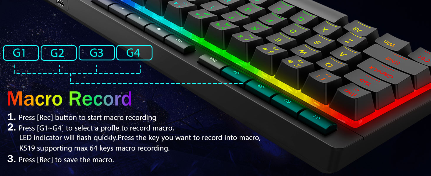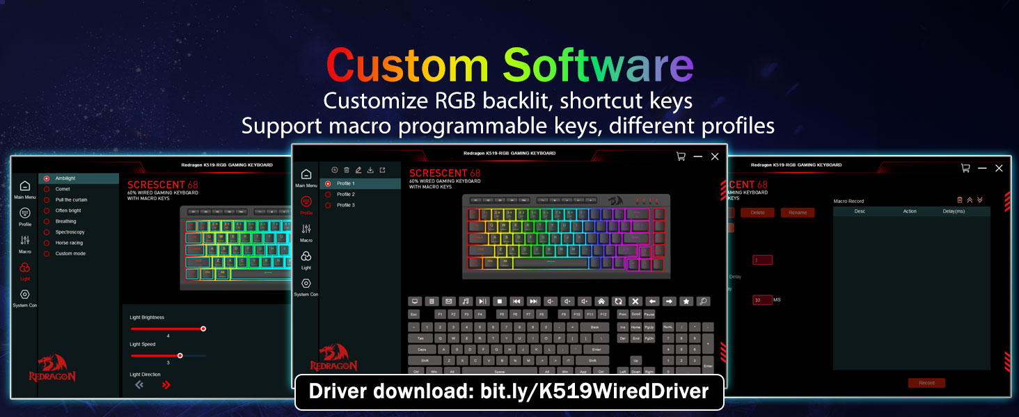सफ्टवेयर समर्थन- आफ्नो नयाँ मोड र प्रभावहरू डिजाइन गर्न उपलब्ध सफ्टवेयर प्रयोग गरेर आफ्नो विकल्पहरू विस्तार गर्नुहोस्। धेरै कुशल काम र गेमिङका लागि विभिन्न कीबाइन्डिङ वा सर्टकटहरूसँग म्याक्रोहरू।