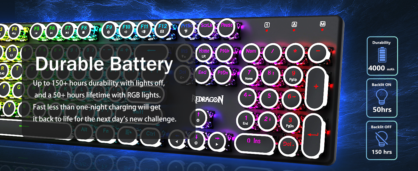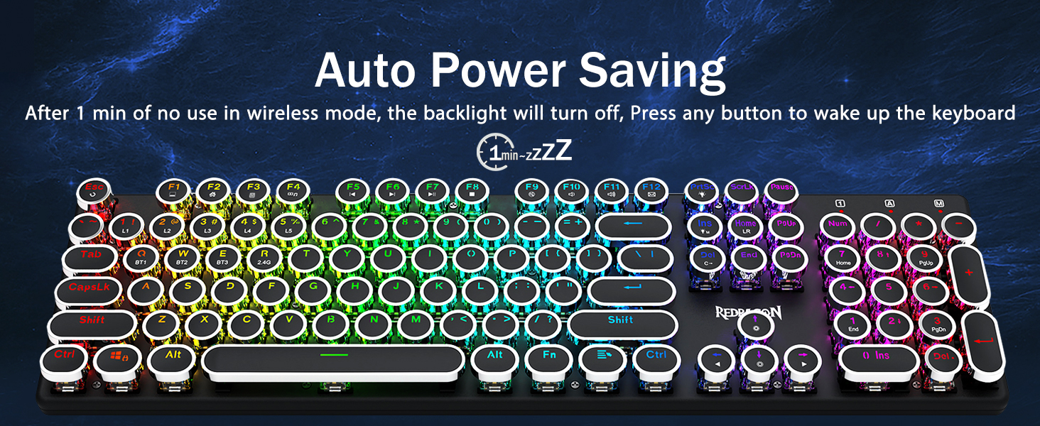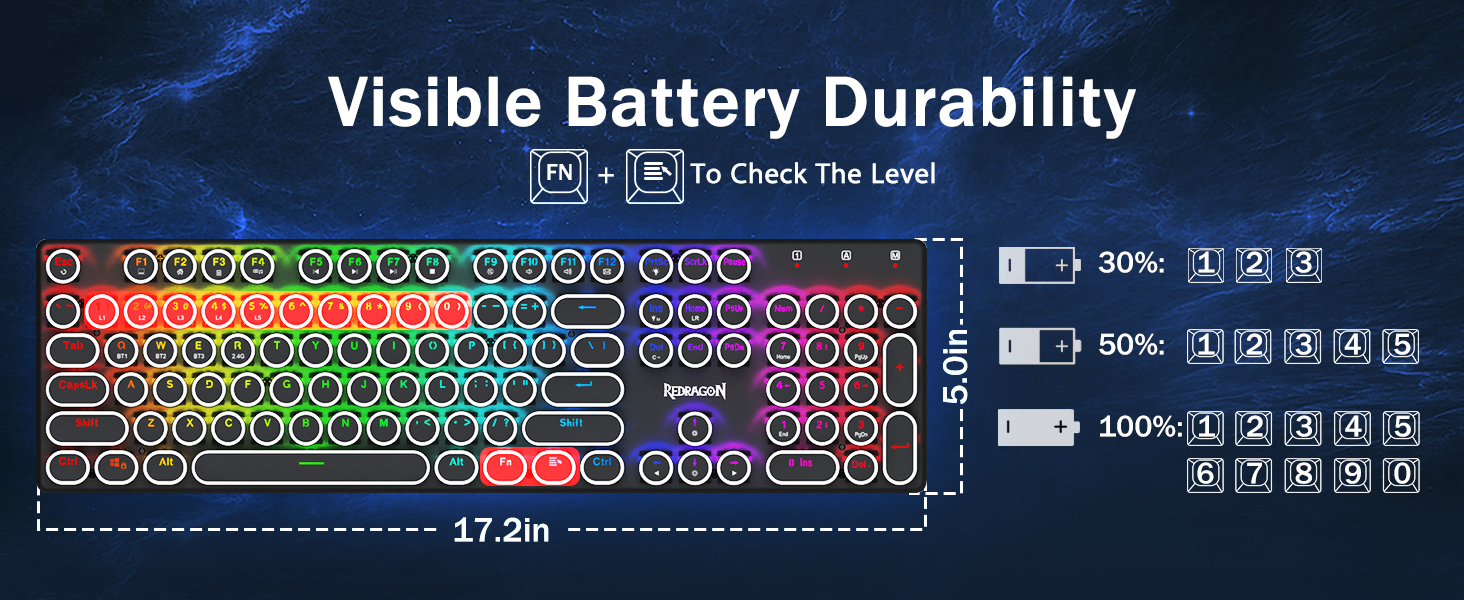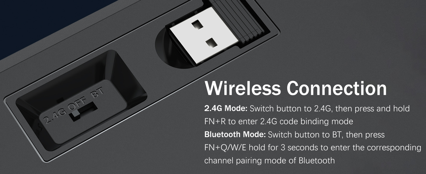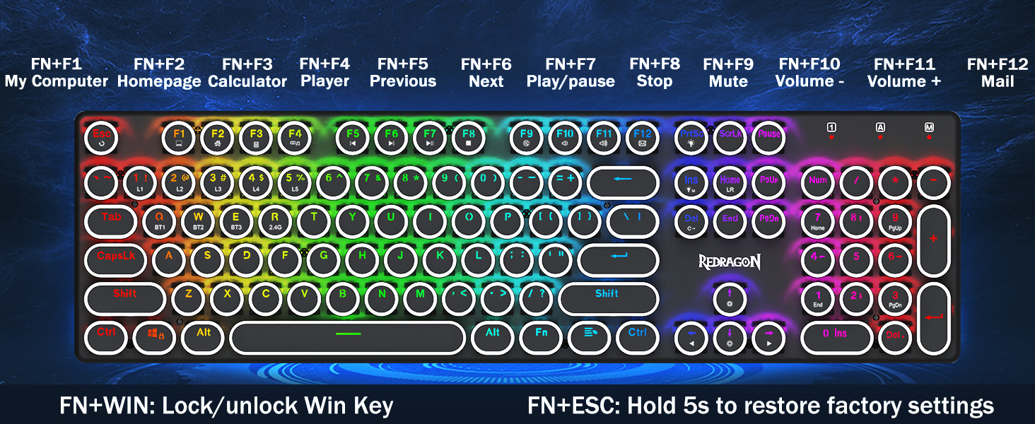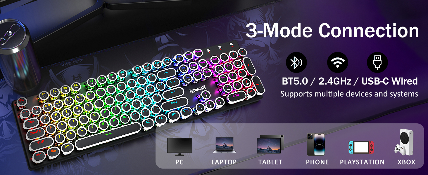𝟯-𝗠𝗼𝗱𝗲 𝗖𝗼𝗻𝗻𝗲𝗰𝘁𝗶𝗼𝗻 -Redragon अभिनव ट्राइ-मोड जडान प्रविधि, USB-C वायर्ड, ब्लुटुथ 5.0/3.0 र 2.4Ghz वायरलेस मोडहरू जसले प्रयोगकर्ता अनुभवलाई सबै क्षेत्रहरूमा अर्को स्तरमा स्तरवृद्धि गराउँछ। ब्लुटुथ मोडमा FN+Q/W/E थिच्नुहोस्, 2.4G मोडमा FN+R थिच्नुहोस्।