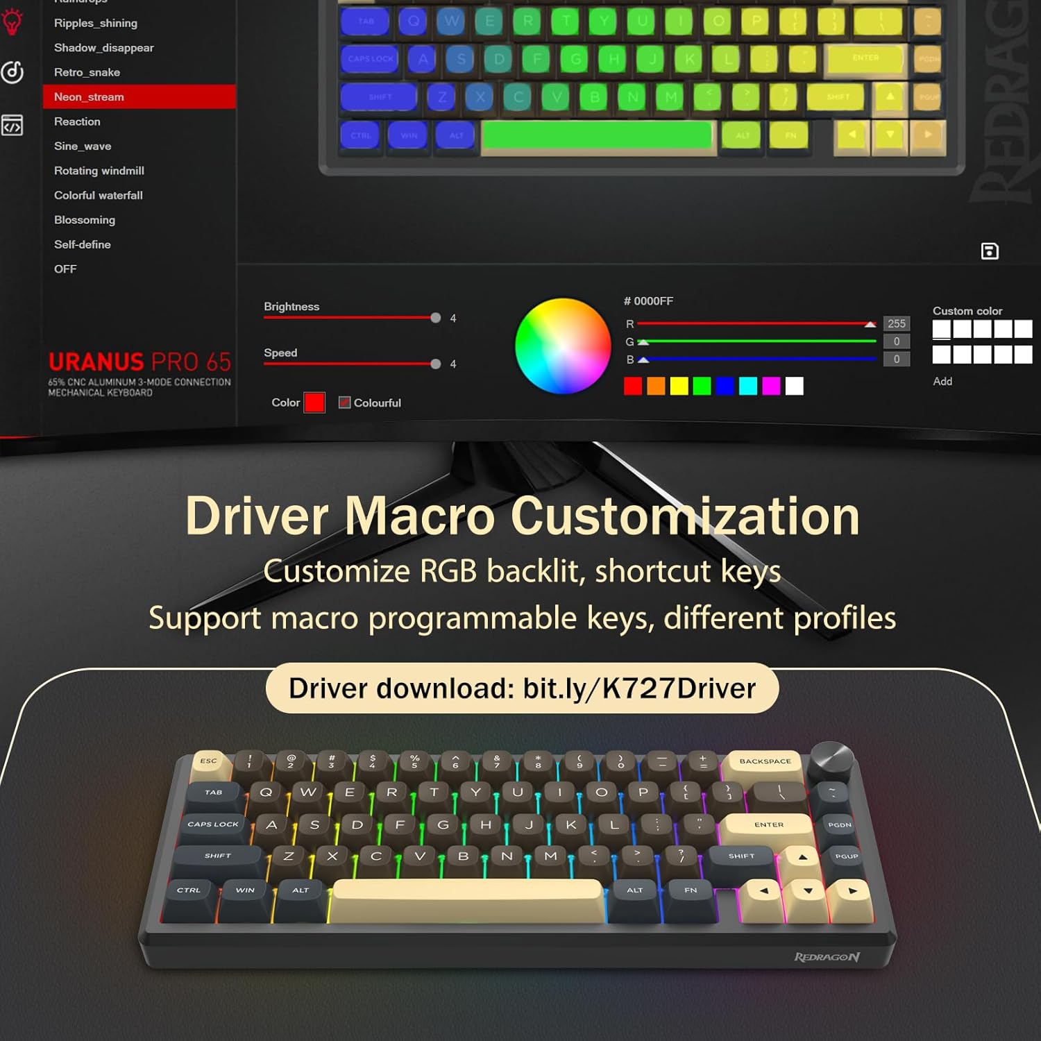 कालो K727 60% वायरलेस मेकानिकल गेमिङ किबोर्डले मेकानिकल स्विचहरूद्वारा समर्थित उत्तरदायी टाइपिङ अनुभव प्रदान गर्दछ। कम्प्याक्ट लेआउटले सुव्यवस्थित सेटअपलाई प्राथमिकता दिने प्रयोगकर्ताहरूको लागि दक्षता सुधार गर्छ।