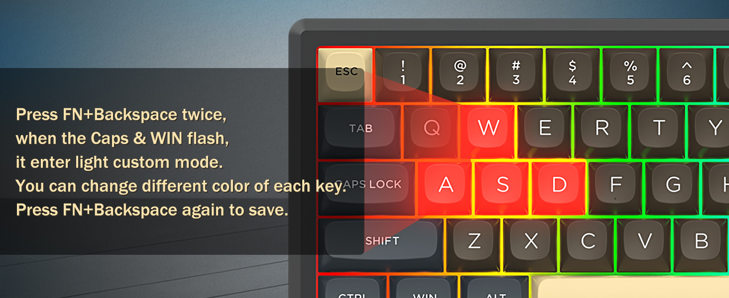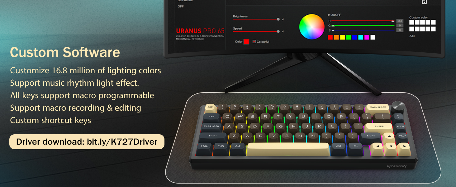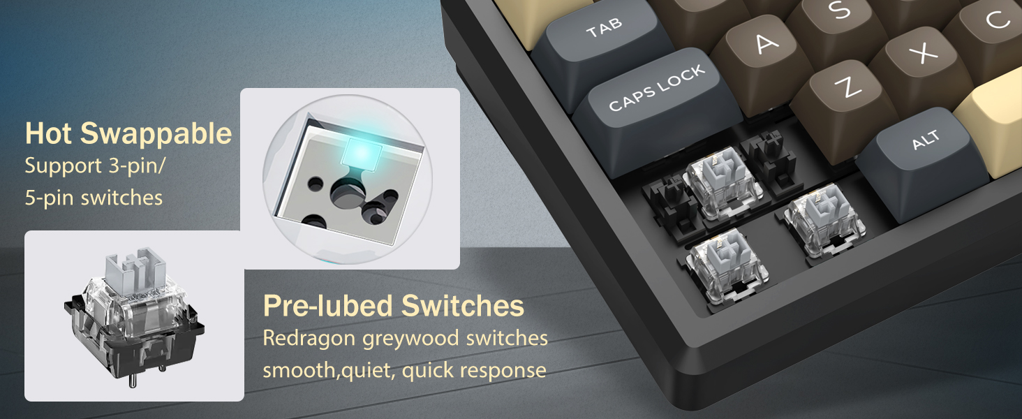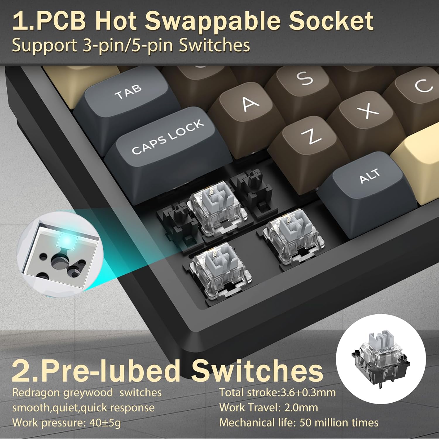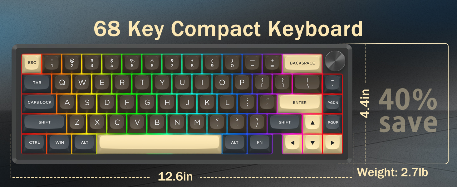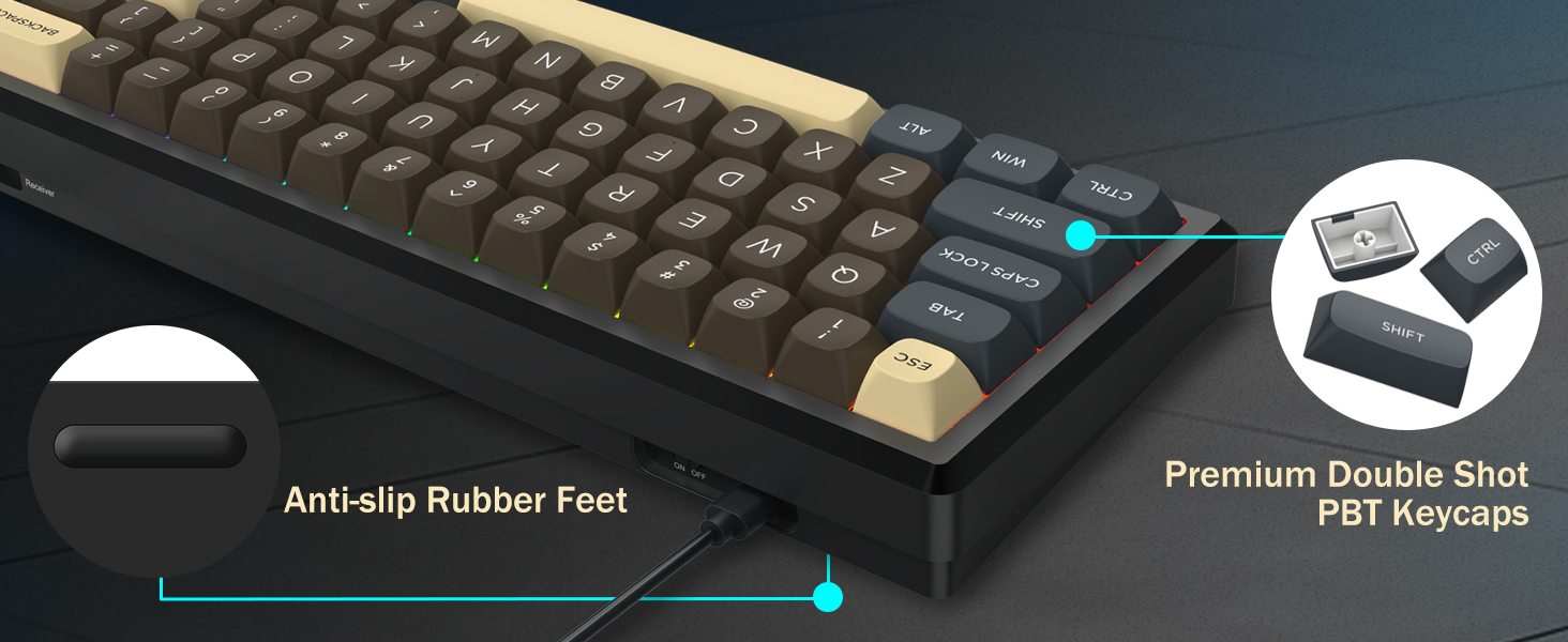 यसको 60% लेआउटको साथ, यो किबोर्डले कुञ्जी संयोजनहरू मार्फत मुख्य कार्यक्षमता राख्दै गैर-आवश्यक कुञ्जीहरू हटाउँछ। यो डिजाइनले डेस्क क्लटर कम गर्न मद्दत गर्दछ र माउसको आन्दोलनको लागि थप ठाउँ प्रदान गर्दछ, यसलाई गेमिङ र उत्पादकता वातावरण दुवैको लागि उपयुक्त बनाउँछ।