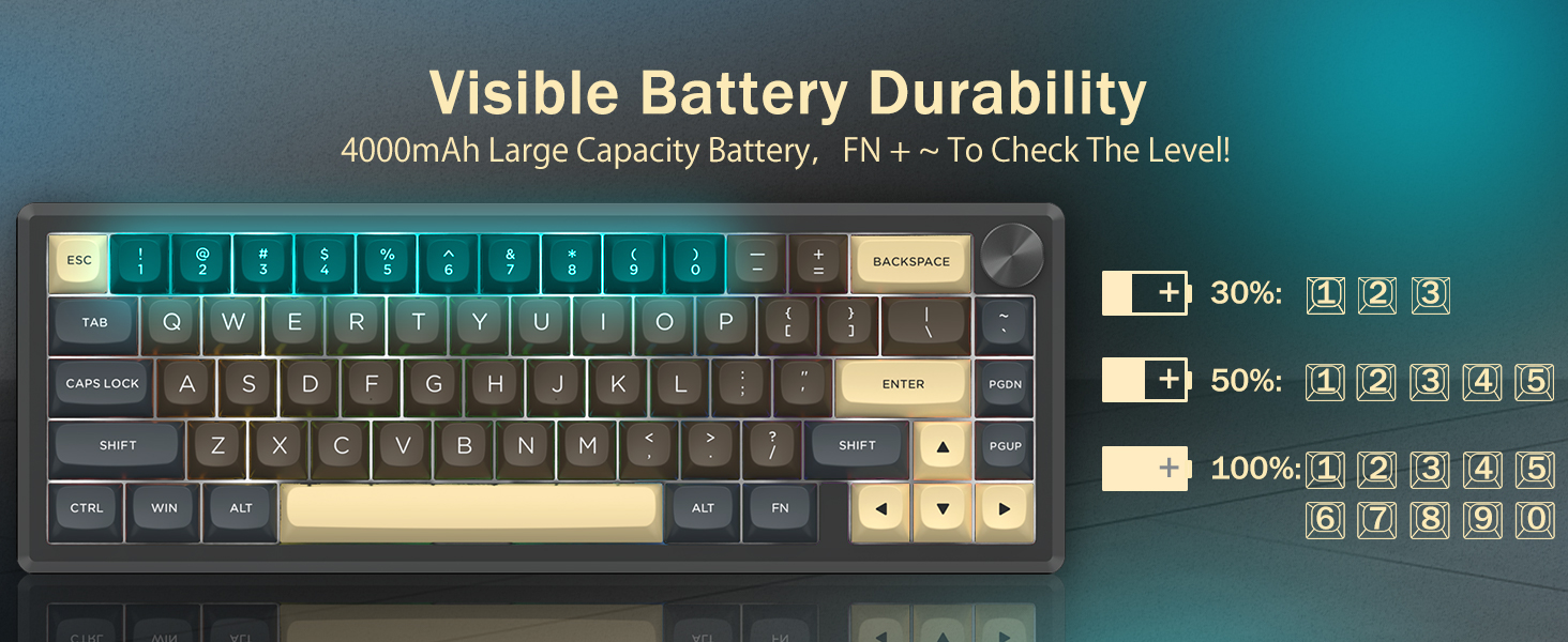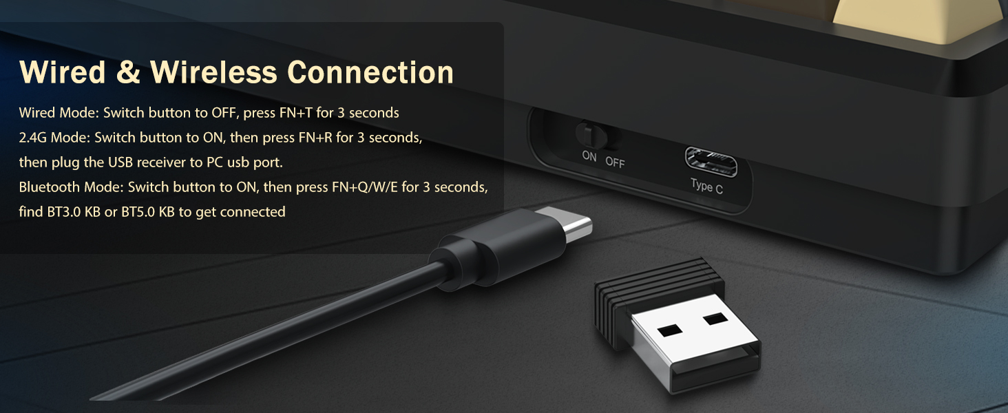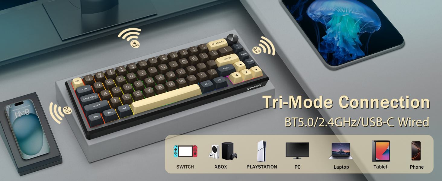 किबोर्डले सुविधाको लागि ताररहित जडान र स्थिर कार्यसम्पादनको लागि तारयुक्त USB जडानलाई समर्थन गर्दछ। प्रयोगकर्ताहरूले तिनीहरूको सेटअपको आधारमा मोडहरू बीच स्विच गर्न सक्छन्।