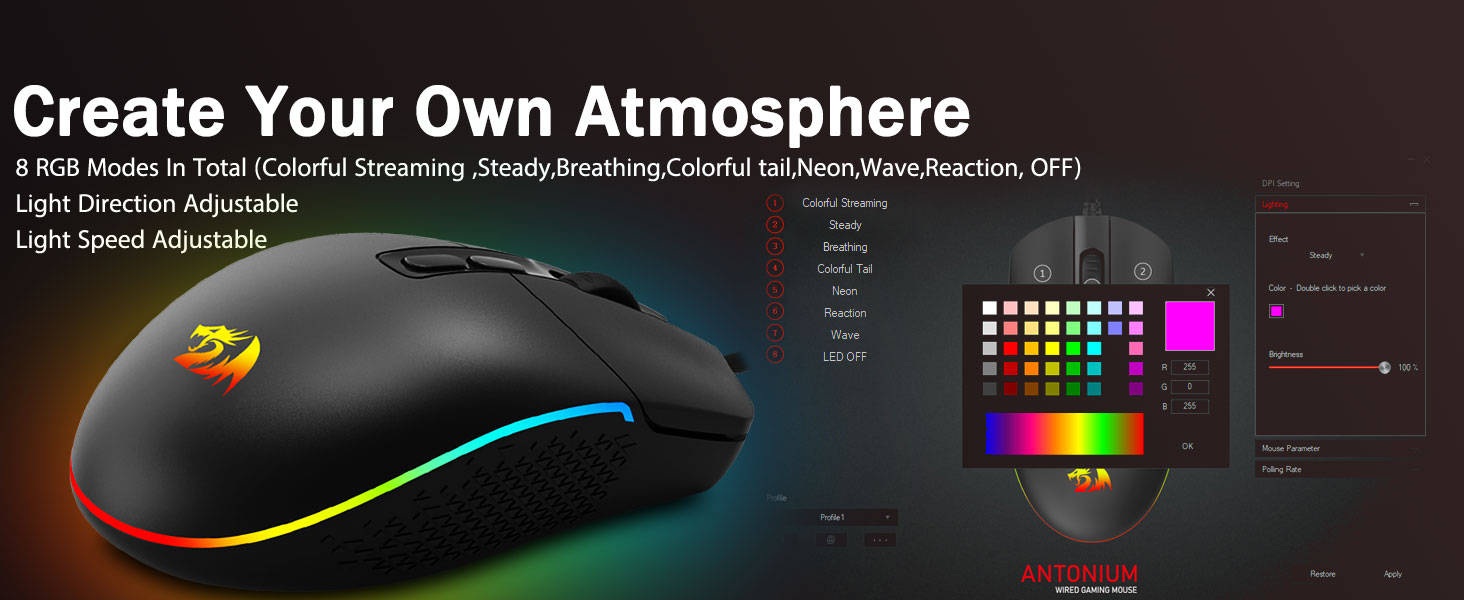 8 सभ्य RGB ब्याकलिट मोडहरू- ब्याकलिट खोल्नुहोस् र तपाइँको गेमिङ रणभूमिमा केही मारहरू बनाउनुहोस्। हाइप गरिएको डायनामिक RGB ब्याकलिट भाइबले तपाइँको गेमिङ स्पेस सजाउँदा तपाइँलाई कहिल्यै निराश पार्ने छैन, यो लाइट अन भएको अन्य रेड्रागन सामानहरूसँग राम्रो हुनेछ।