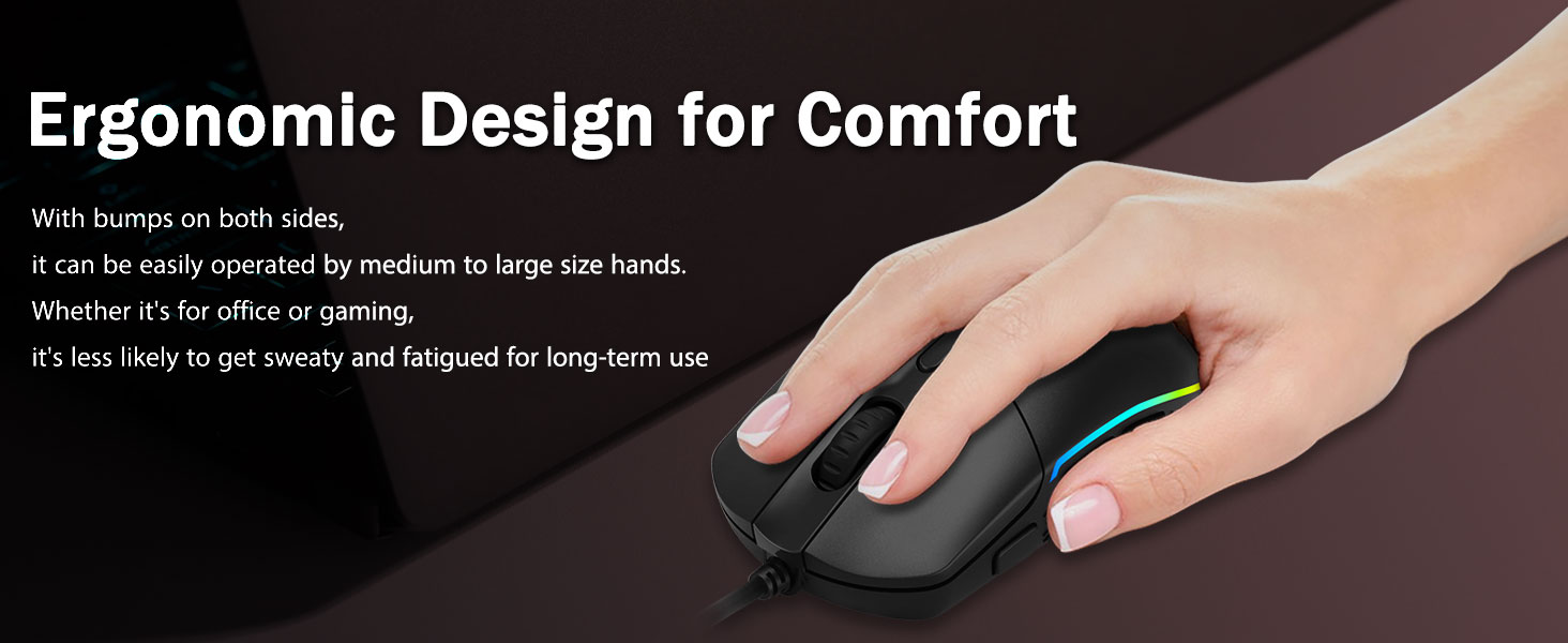 कम्फर्ट ग्रिप- दुबै छेउमा एर्गोनोमिक बम्पहरूले गेमिङ मुसालाई कुनै पनि हातमा फिट बनाउँछ। यसले खेलाडीहरूलाई लामो समयसम्म तीव्र गेमप्लेको समयमा पनि थकान बिना नै दिर्घकालिन आराम प्रदान गर्दछ। गेमिङ माउस उठाउँदा वा छिटो र सटीक स्वाइप गर्दा यो चिप्लिनेछैन।
