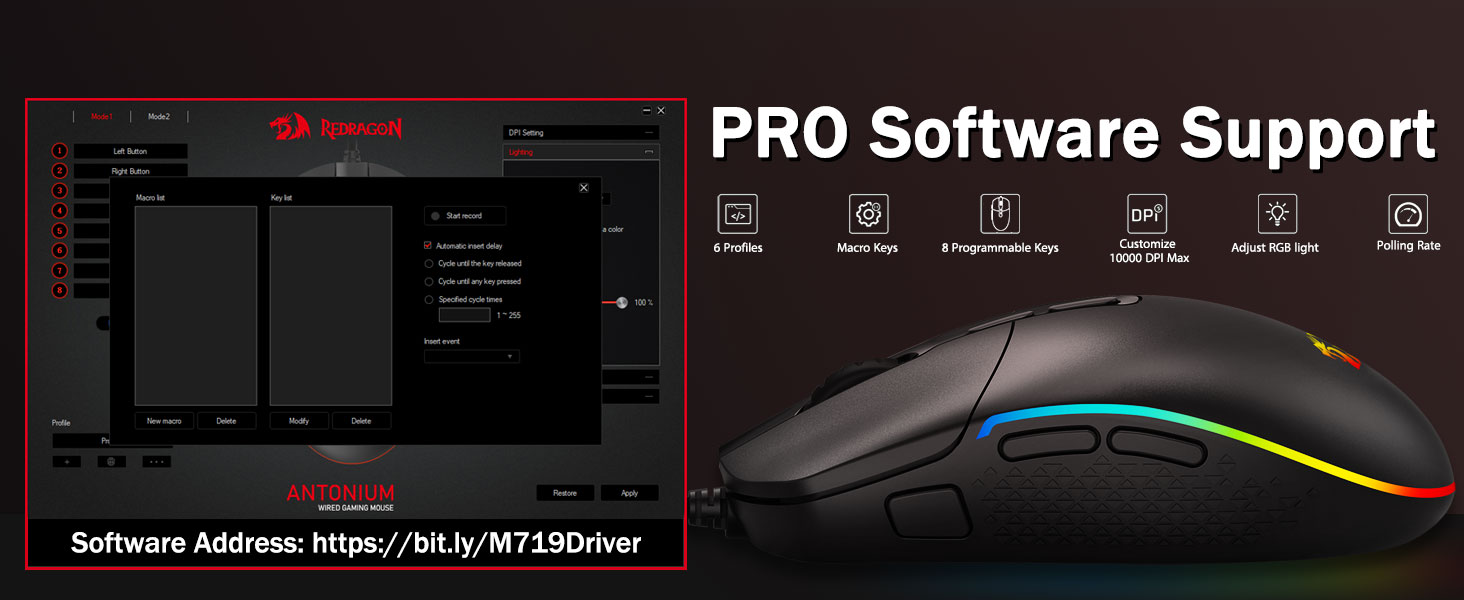 कुनै पनि बटन पुन: असाइन गर्न योग्य छ- 8 प्रोग्रामेबल बटनहरू जुनसुकै खेल वा कार्यमा तपाइँ संलग्न हुनुहुन्छ अनुकूलन योग्य रणनीतिक किबाइन्डहरूसँग सबै सम्पादन योग्य छन्। १ र्यापिड फायर + २ साइड म्याक्रो बटनहरूले तपाईंलाई राम्रो गेमिङ र काम गर्ने अनुभव प्रदान गर्दछ।