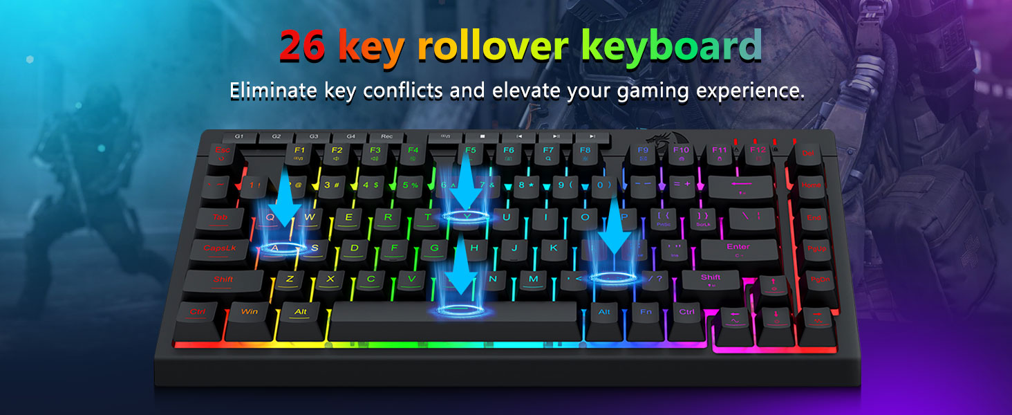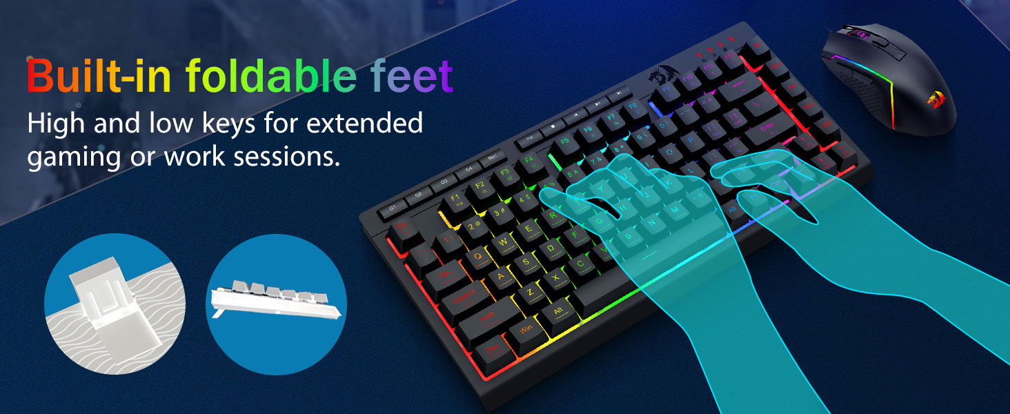 【आरामदायी गेमिङ】किबोर्डको फोल्ड गर्न मिल्ने स्ट्यान्ड, छाला-मैत्री कोटिंग, र फ्लोटिंग कीक्याप्सले टाइपिङ आराम बढाउँछ। 26 कुञ्जीहरू एन्टी-गोस्टिङले प्रत्येक बटन ट्रिगर गर्न सकिन्छ भन्ने सुनिश्चित गर्दछ। WIN कुञ्जी गेमिङका लागि असक्षम गर्न सकिन्छ। यो किबोर्ड र माउस अधिकतम आराम सुनिश्चित गर्दै एक कुशल गेमिङ अनुभव प्रदान गर्न समर्पित छन्