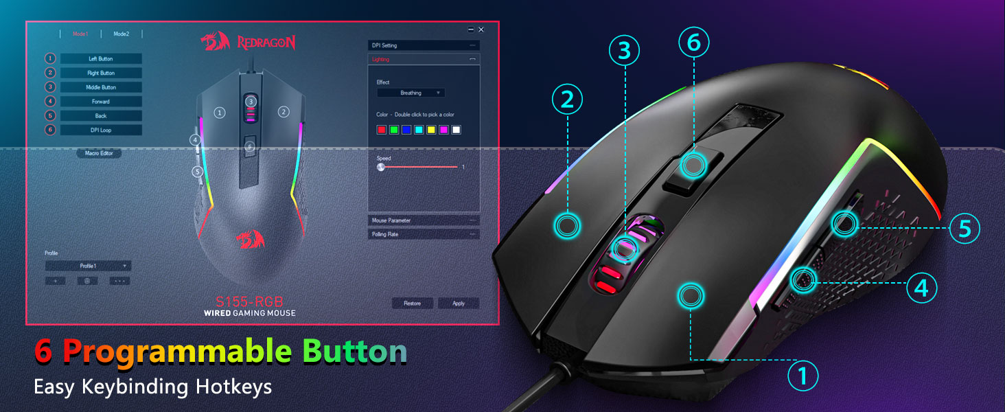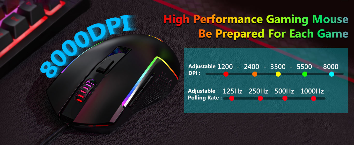 【व्यावसायिक गेमिङ माउस】तपाईंले गेमिङ वा काममा आफ्ना विभिन्न आवश्यकताहरू सजिलै पूरा गर्न DPI बटन मार्फत वा सफ्टवेयर ड्राइभर मार्फत 1200 देखि 8000 सम्म वा 100 देखि 8000 सम्म DPI समायोजन गर्न सक्नुहुन्छ। कुल 7 बटनहरू जसमध्ये 6 प्रोग्रामयोग्य छन्। उच्च परिशुद्धता सेन्सरले पिनपोइन्ट सटीकता प्रदान गर्दछ जबकि गेमिङ ग्रेड माइक्रो स्विचहरूले दीर्घायु, बढी स्थायित्व र चरम प्रतिक्रियाशीलता सुनिश्चित गर्दछ, तपाइँलाई तपाइँको प्रतिस्पर्धामा अझ ठूलो किनारा प्रदान गर्दछ। (सफ्टवेयरले 1000Hz सम्म माउस मतदान दर समायोजन गर्न पनि समर्थन गर्दछ)