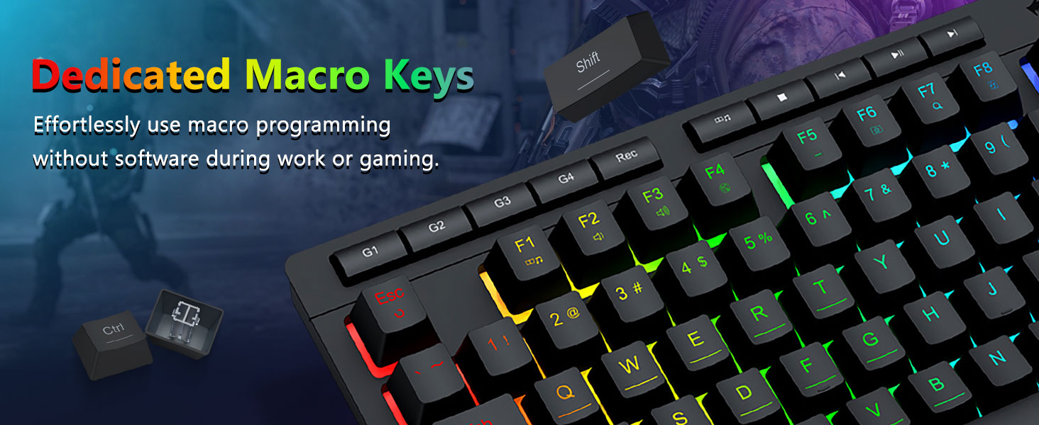 【दक्ष र सुविधाजनक】यो गेमिङ किबोर्ड र माउस कम्बो 4 अन-बोर्ड म्याक्रो कुञ्जीहरू, 5 स्वतन्त्र मल्टिमिडिया कुञ्जीहरू र 12 FN मल्टिमिडिया फंक्शन कुञ्जीहरू, सरल र सञ्चालन गर्न सजिलोसँग सुसज्जित छ। यसले दक्षतामा सुधार मात्र गर्दैन तर तपाइँको गेमिङ प्रक्रियालाई थप सुविधाजनक र छिटो बनाउँछ