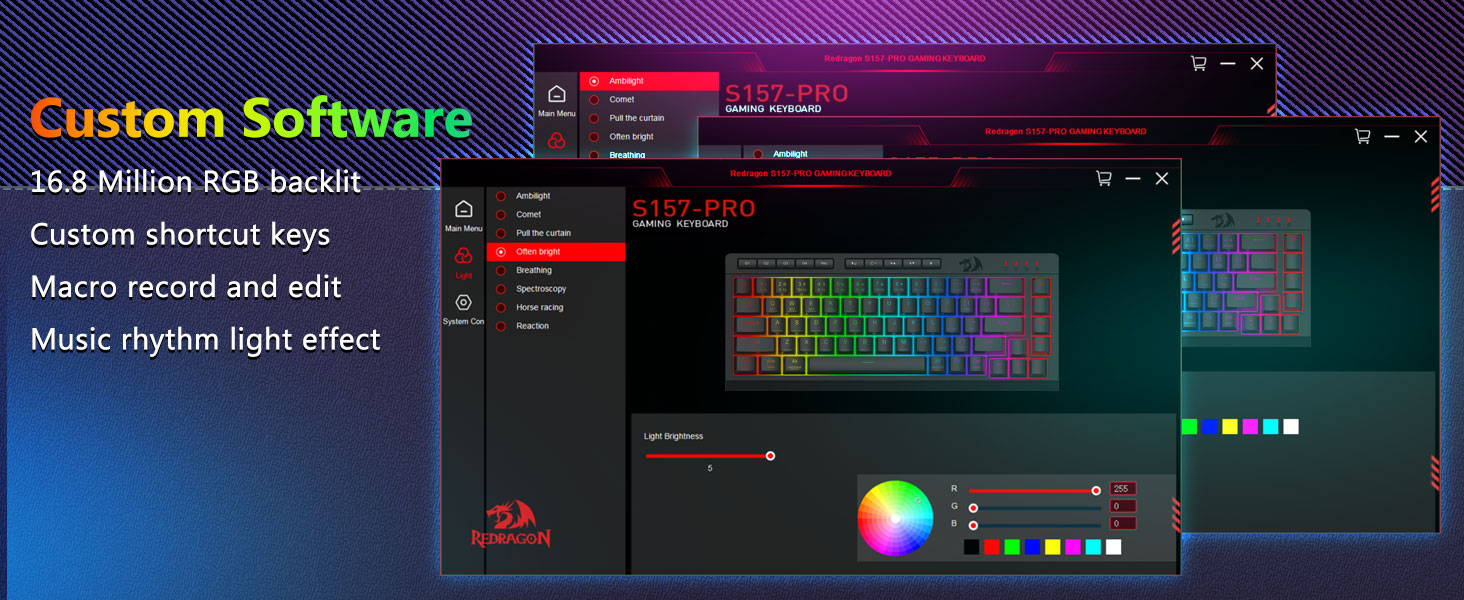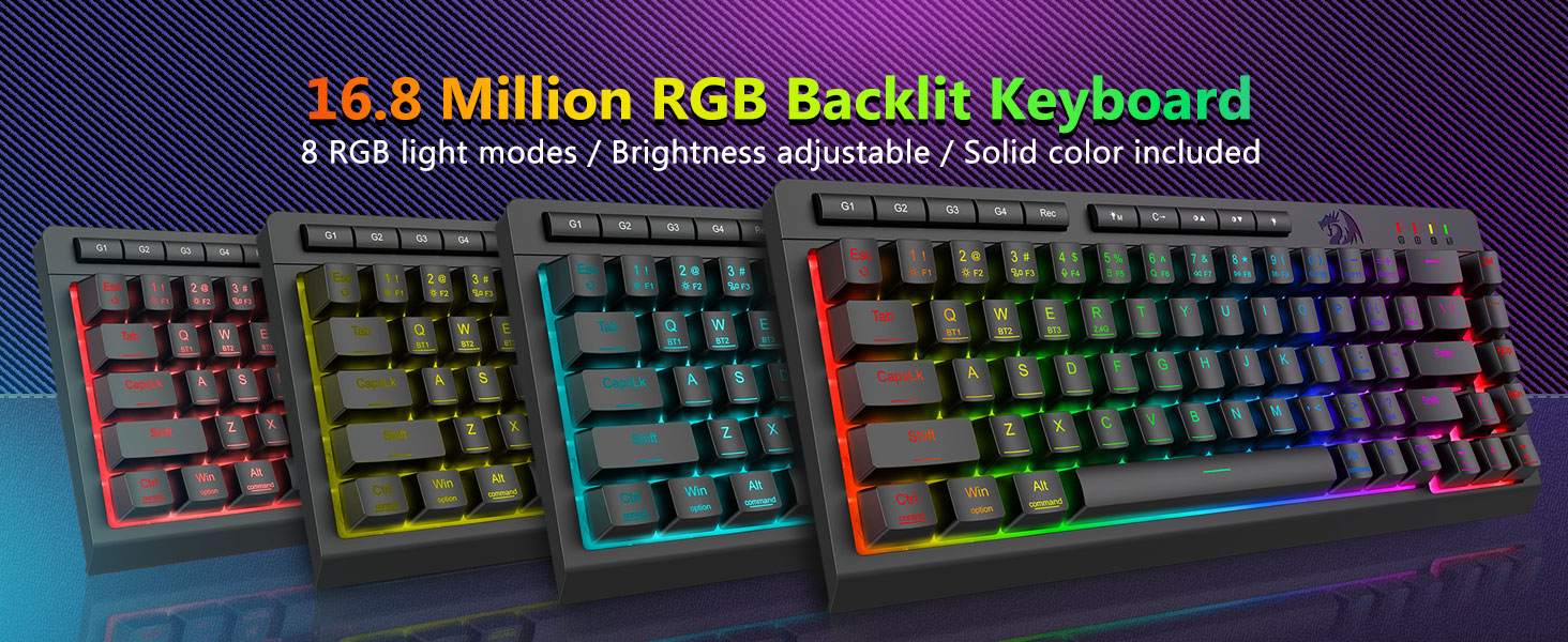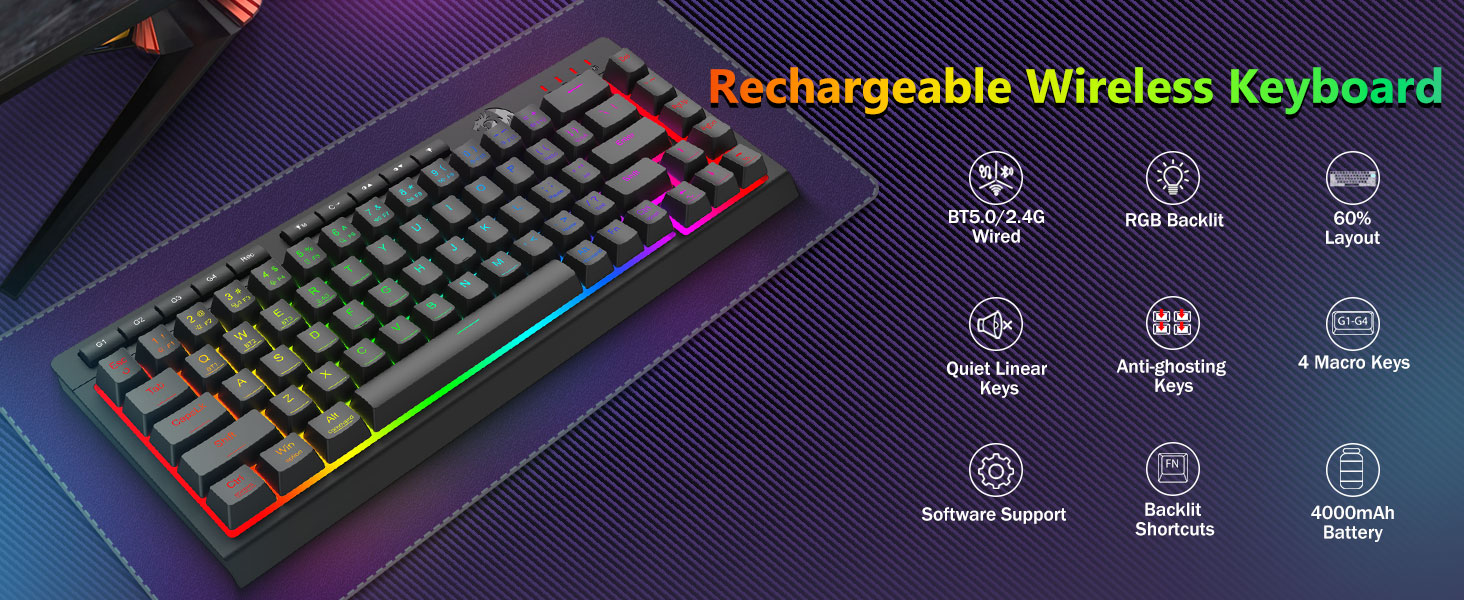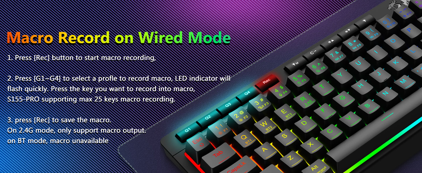 अनुकूलन योग्य म्याक्रो, समर्पित ब्याकलिट नियन्त्रणहरू- 4 अनबोर्ड म्याक्रो कुञ्जीहरू (G1-G4) तुरुन्तै प्रोग्राम गर्नुहोस् - कुनै सफ्टवेयर आवश्यक छैन। गेमिङका लागि जटिल कम्बोहरू, उत्पादकताका लागि सर्टकटहरू, वा मिडिया आदेशहरू रेकर्ड गर्नुहोस्। सेकेन्डमा आफ्नो कार्यप्रवाह पुन: परिभाषित गर्नुहोस्। तपाईं कार्यहरू अनुकूलन गर्न, म्याक्रोहरू सिर्जना गर्न, RGB लाइटहरू समायोजन गर्न र सर्टकटहरू सेट गर्न सफ्टवेयर प्रयोग गर्न सक्नुहुन्छ। तपाइँले चाहेको तरिकाले छिटो र सटीक खेल प्रतिक्रियाहरूको लागि 26 कुञ्जीहरूलाई एकै साथ काम गर्न अनुमति दिने एन्टी-गोस्टिङ कुञ्जीहरू (अण्डरस्कोरसहितको कुञ्जीहरू) सुविधा। उज्यालो, प्रकाश मोड, र खेल मोडको लागि द्रुत पहुँच बटनहरू द्रुत रूपमा चमक, प्रकाश प्रोफाइलहरू समायोजन गर्न र बटनको स्पर्शले खेल मोड सक्षम गर्न।