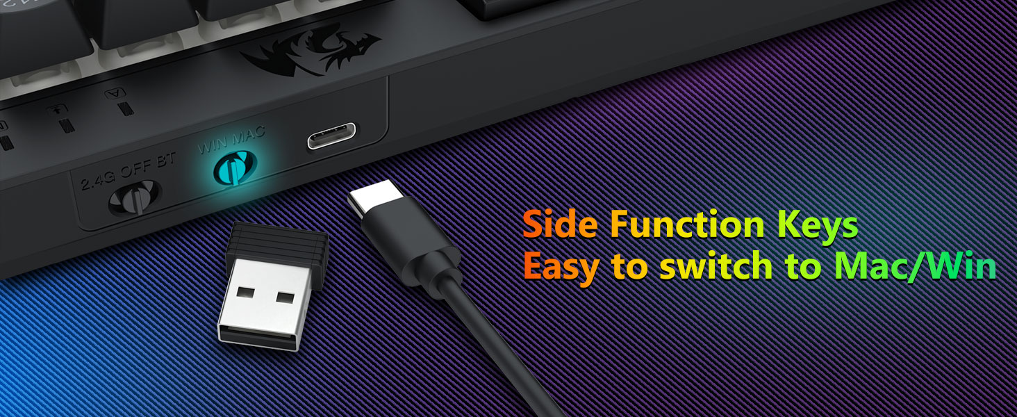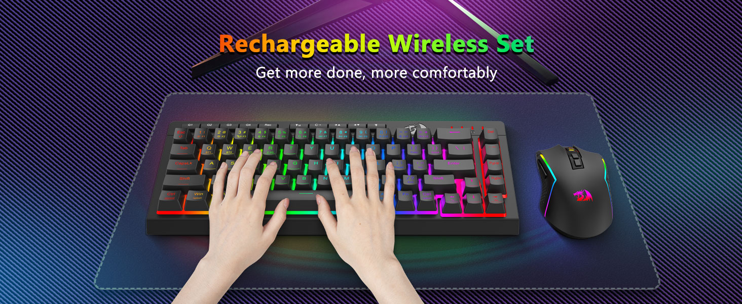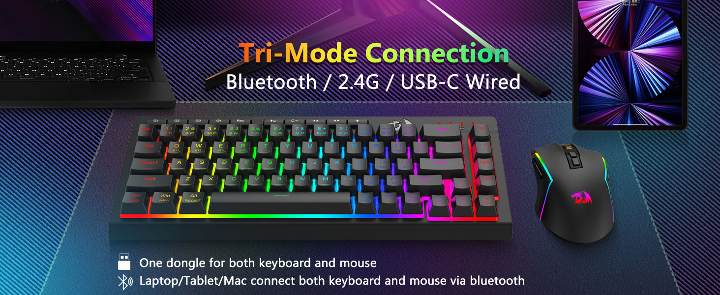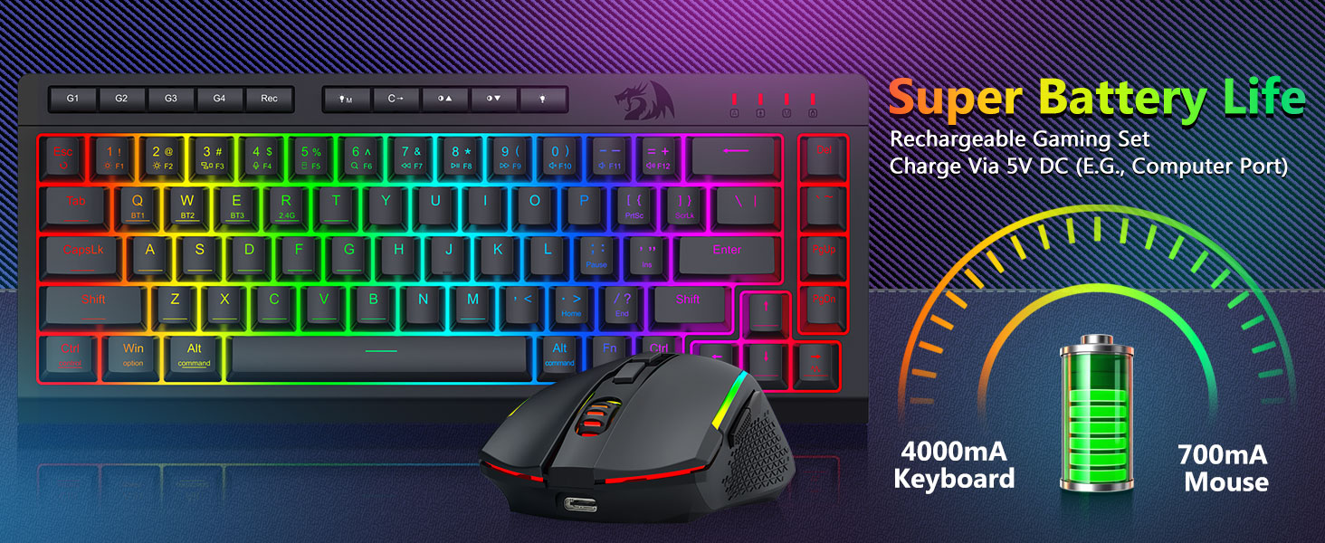 त्रि-मोड बहुमुखी प्रतिभा किबोर्ड र माउस- विभिन्न यन्त्रहरू (PC, Mac, ट्याब्लेट, फोन, PS/XBOX) मा जडान गरी ब्लुटुथ 5.0, 2.4GHz वायरलेस, वा USB-C वायर्ड मोडहरू बीच निर्बाध रूपमा स्विच गर्नुहोस्। सहज रूपमा सर्टकट कुञ्जीहरू वा साइड बटन मार्फत उपकरणहरू टगल गर्नुहोस् — हाइब्रिड कार्य/गेमिङ सेटअपहरूको लागि उपयुक्त। 4,000mAh ब्याट्री किबोर्ड र 700mAh ब्याट्री माउस (30+ दिन स्ट्यान्डबाइ, 50hrs RGB रनटाइम) को साथ हप्ताहरू सम्म संचालित रहनुहोस्।