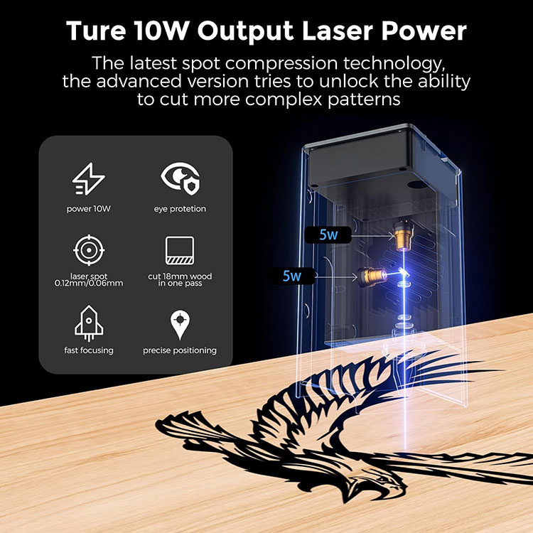 · 【सही उत्कीर्णन र काट्ने】0.06 x 0.06mm को राम्रो स्थान फोकसले 0.004 इन्च भित्र र 0.007 इन्च भित्र परिशुद्धता पुन: स्थितिमा उत्कीर्ण / काट्ने सटीकताको सटीक नियन्त्रणको लागि अनुमति दिन्छ। दोहोरो स्टेपर मोटरहरू र एकीकृत एल्युमिनियम मिश्र डिजाइनको साथ निर्मित 32-बिट मेनबोर्डले उच्च-गति आन्दोलनको समयमा स्थिरता प्रदान गर्दछ। एकै साथ मापदण्डहरू सेट गरेर, रंगीन डिजाइनहरू पनि उत्कीर्ण गर्न सकिन्छ।