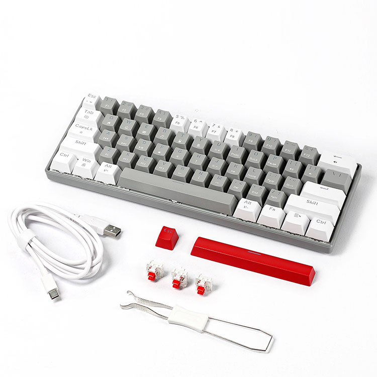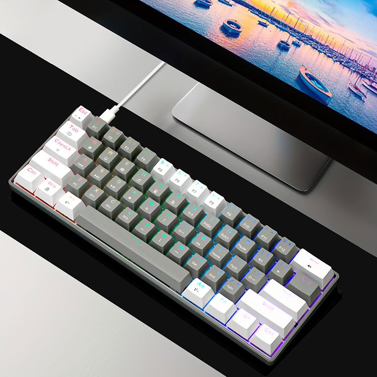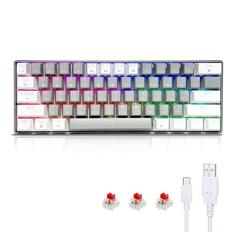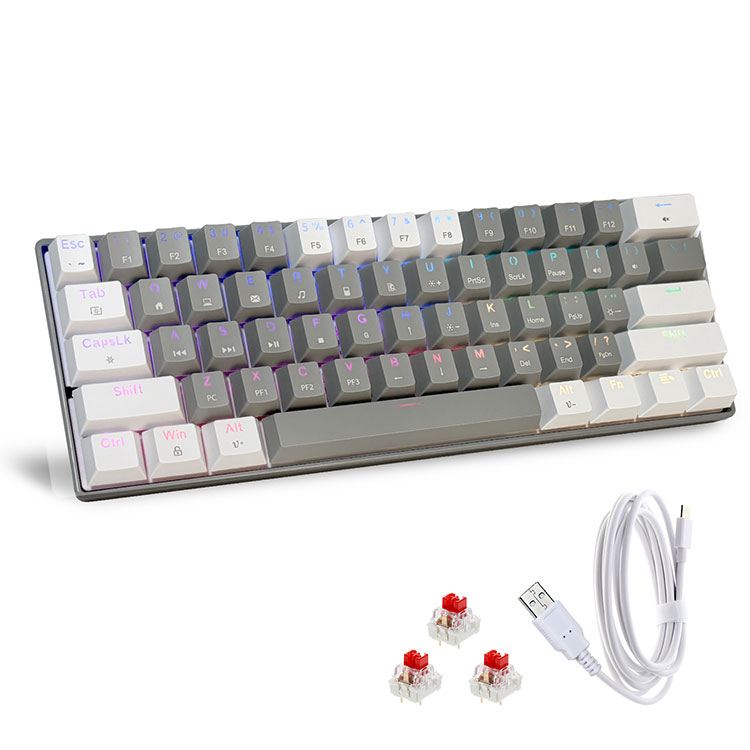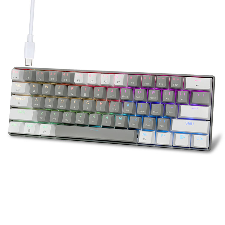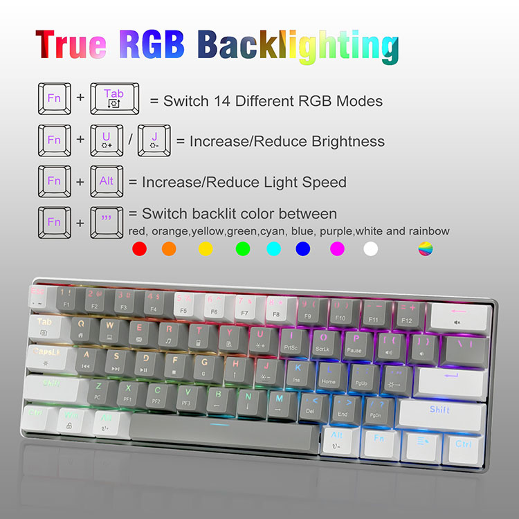 · कूल RGB ब्याकलाइटप्रभाव 60% RGB किबोर्डमा 14 ब्याकलाइट प्रभावहरू र 8 ठोस ब्याकलाइट रङ स्विचिङ समावेश छन्। फरक RGB सेटिङले तपाईंको टाइपिङ समयलाई समृद्ध बनाउँछ। प्रकाश गति र स्तर पनि आफ्नो आवश्यकता अनुसार समायोजित गर्न सकिन्छ। डबल शट इन्जेक्शन कीक्याप्स, क्यारेक्टर कहिल्यै फेड हुँदैन।