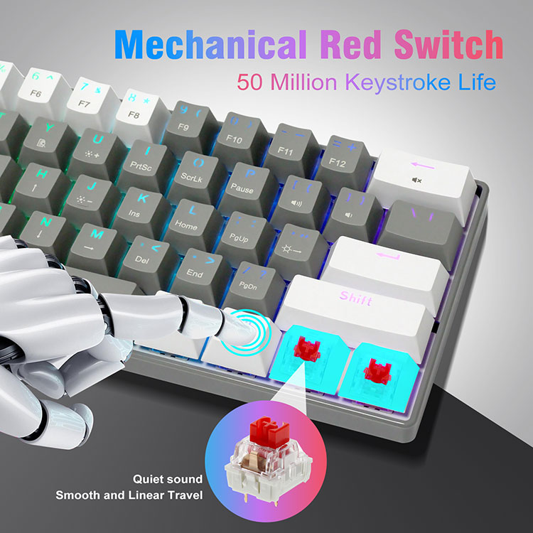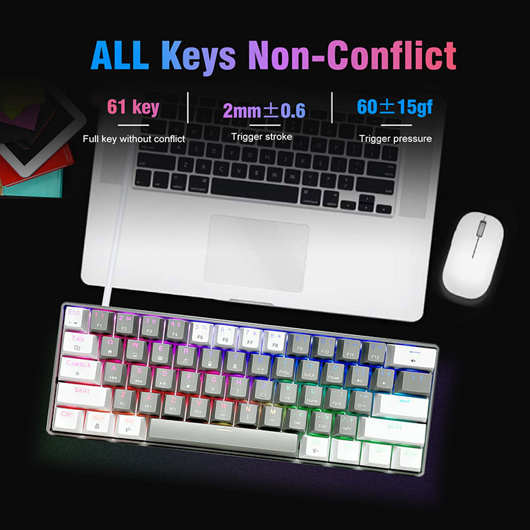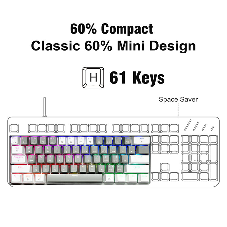 · 60 प्रतिशत किबोर्ड पोर्टेबल डिजाइनयो पोर्टेबल 60% RGB मेकानिकल गेमिङ किबोर्डको एकदम सही साइज छ र यो सबै वातावरणका लागि राम्रो छ, व्यापार यात्रा खेल अफिस गृह प्रयोग, Numpad बिना, गेमरहरू र टाइपिस्टका लागि अधिक व्यावहारिक, तपाईंको डेस्कटपमा थप ठाउँ दिनुहोस्।