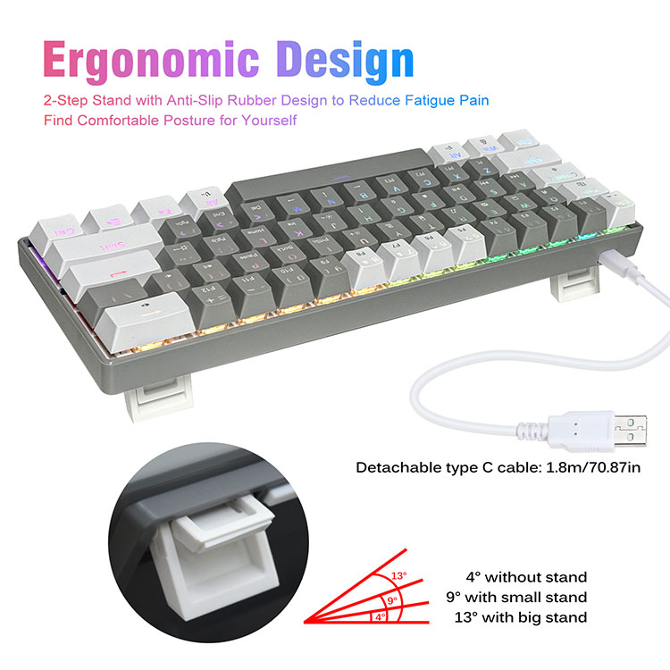 · पूर्ण एन्टी-गोस्टिङ र एर्गोनोमिकसबै 61 कुञ्जीहरू कुनै विरोधाभासपूर्ण छैनन्, सेतो ग्रे म्यास अप डिजाइन, एर्गोनोमिक सस्पेन्सन डबल-रङ इन्जेक्सन किक्याप, डबल किकस्ट्यान्ड फीट समायोजन योग्य टाइपिङ कोण र छुट्याउन मिल्ने USB केबल, व्यावहारिक र सुन्दर दुवै।