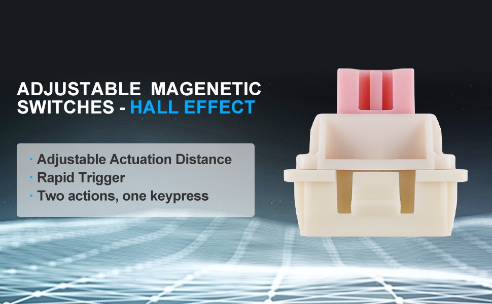 चुम्बकीय स्विचहरूले हल प्रभाव सेन्सरहरू प्रयोग गर्दछ कुञ्जी आन्दोलन पत्ता लगाउन, समायोज्य एक्च्युएशन बिन्दुहरू र लगातार इनपुट पहिचान प्रदान गर्न। परम्परागत मेकानिकल स्विचहरूको विपरीत, यो प्रविधिले शारीरिक पहिरन कम गर्छ र दीर्घकालीन स्थिरता सुनिश्चित गर्दछ।