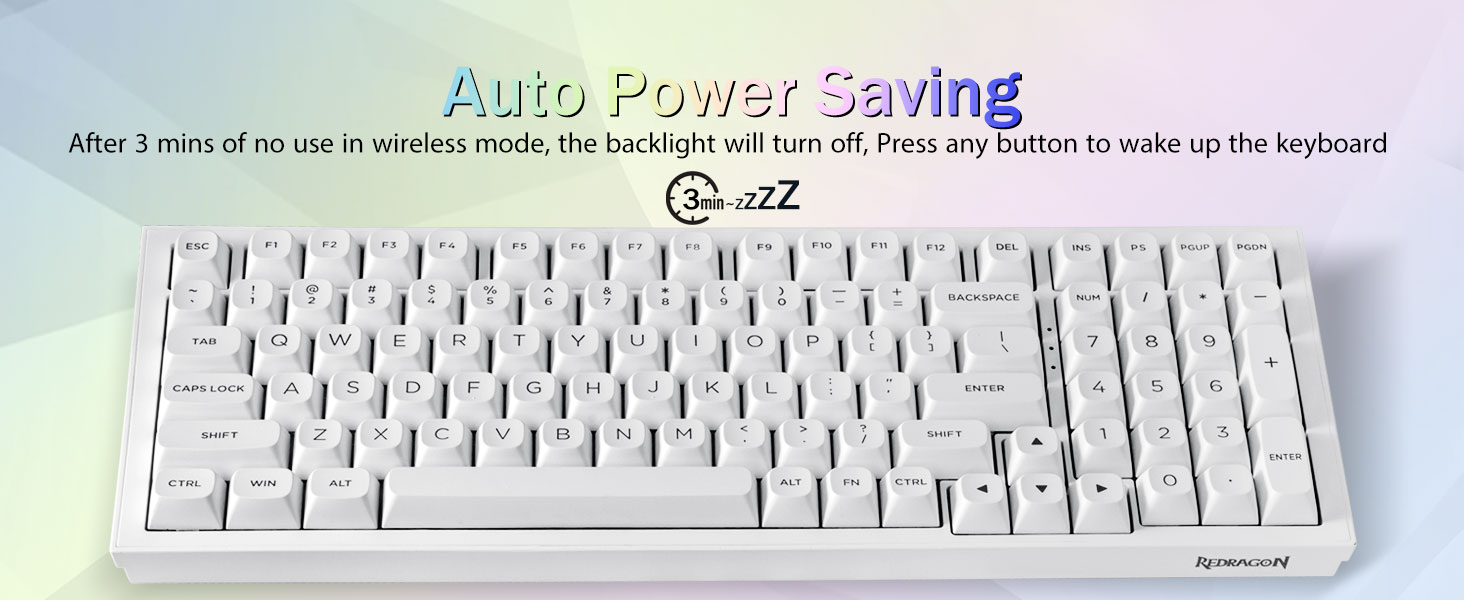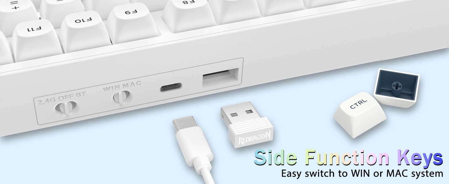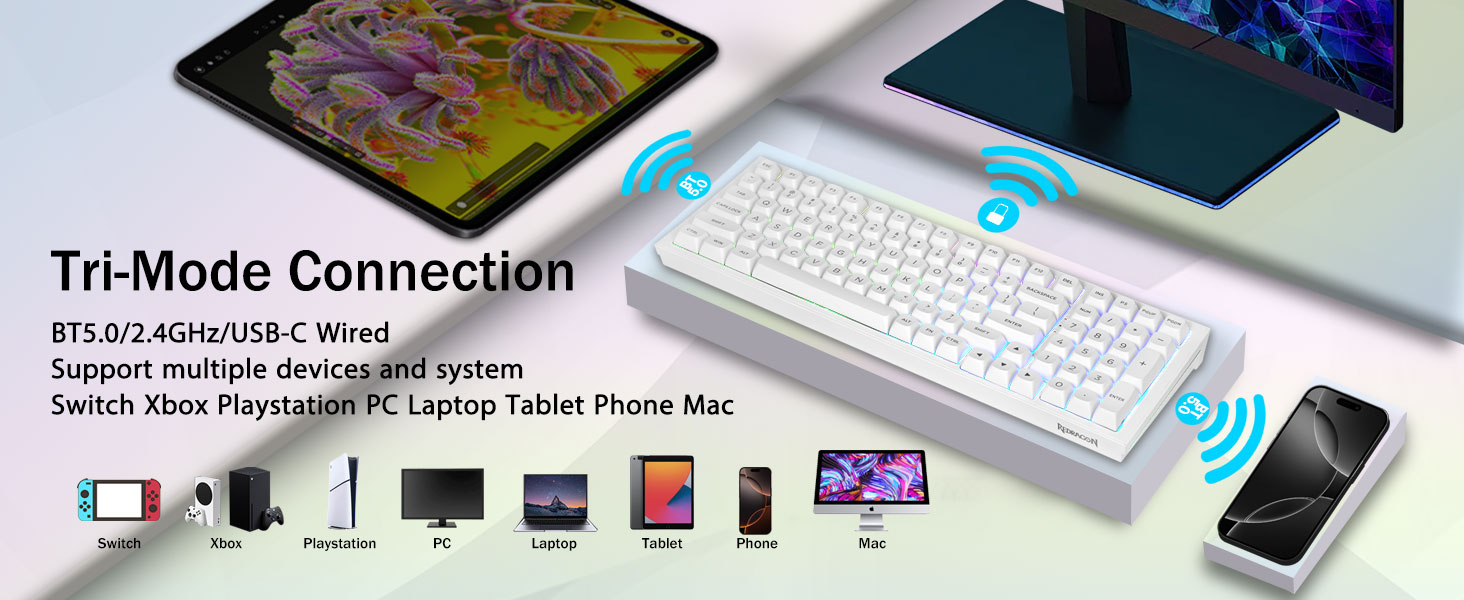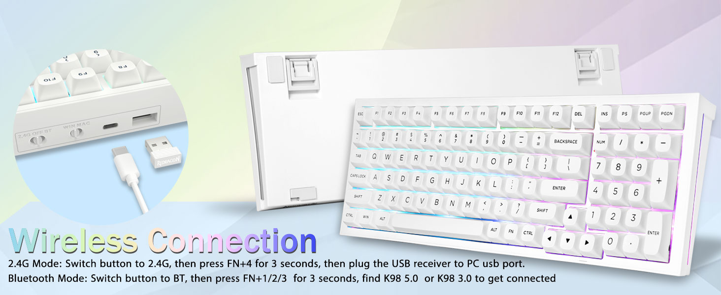 बहु-उपकरण जडान:Redragon K723 ताररहित मेकानिकल किबोर्डले BT5.0, 2.4GHz वायरलेस मोड, र USB तार मोड सहित तीन जडान विधिहरू प्रदान गर्दछ। यो एकै समयमा पाँचवटा यन्त्रहरूमा जडान गर्न सकिन्छ, र FN र कुञ्जी संयोजन कुञ्जीहरू द्वारा सजिलैसँग तिनीहरू बीच स्विच गर्न सकिन्छ। काम, गेमिङ र अध्ययनका आवश्यकताहरू पूरा गर्न तपाईंको किबोर्ड जडानको बारेमा कुनै सीमा छैन।