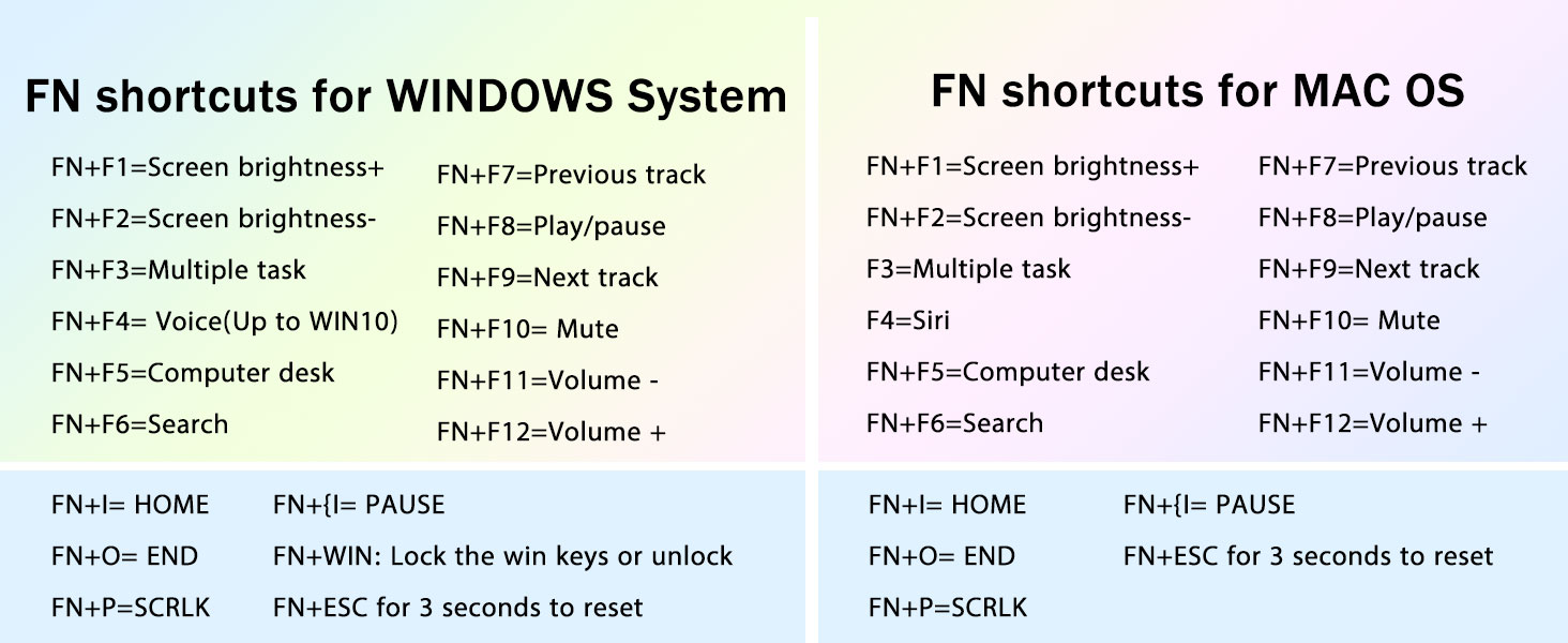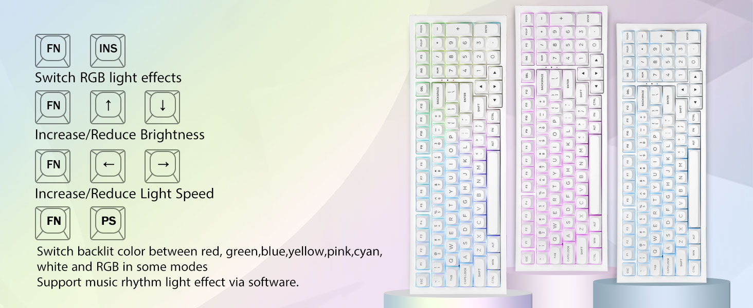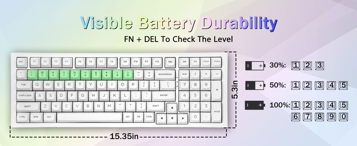 PBT Keycaps र 4000mAh ब्याट्री:९९ कुञ्जी ९६% लेआउट कम्प्याक्ट किबोर्डले खेल र कामका लागि आवश्यक तीर कुञ्जी र नम्बर क्षेत्र राख्दा थप डेस्कटप ठाउँ बचत गर्न सक्छ। थप शक्ति र लामो ब्याट्री जीवन प्रदान गर्न रिचार्जेबल किबोर्ड निर्मित 4000mAh ठूलो क्षमता ब्याट्री। डबल शट PBT कीक्यापहरू, दुई रङहरू एकअर्कामा ढालिएको सामग्रीबाट बनेका छन्, किक्यापका क्यारेक्टरहरूले भाइब्रेन्स र संतृप्तता कायम राख्छन्, स्पष्ट र फेड हुँदैन।