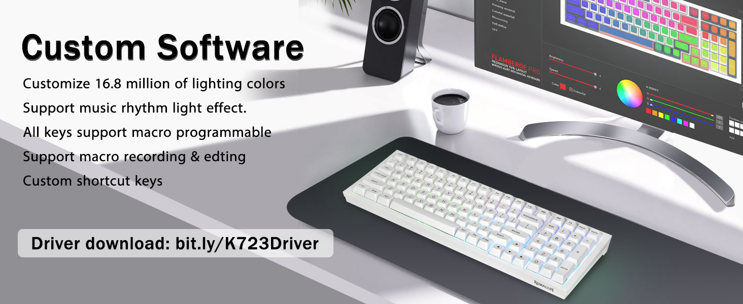 मेकानिकल गेमिङ किबोर्ड:K723 काम र खेल दुवैको लागि प्रिमियम मेकानिकल किबोर्ड हो। खेल कोठामा उत्कृष्ट वातावरण थप्न 16 RGB प्रकाश प्रभावको साथ। कुञ्जीहरूले म्याक्रो अनुकूलनलाई समर्थन गर्दछ, जसले म्याक्रो रेकर्डिङ र सम्पादन गर्न अनुमति दिन्छ, कुञ्जी प्रकार्य र 16.8 मिलियन हल्का रङहरू अनुकूलित गर्दछ, र ड्राइभरसँग कूल संगीत ताल प्रकाश प्रभावहरूलाई समर्थन गर्दछ। एन-कुञ्जी रोलओभर, किबोर्डले एकै समयमा धेरै कुञ्जी प्रेसहरूमा प्रतिक्रिया दिन सक्छ, जुन धेरै रोमाञ्चक वास्तविक-समय खेलहरूमा उपयोगी छ।