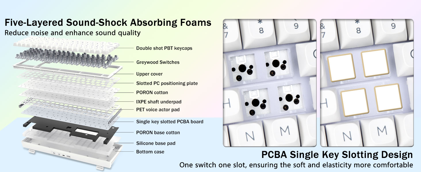 ग्यास्केट संरचना र पीसीबी एकल कुञ्जी स्लटिंग:यो कम्प्यूटर किबोर्डले ग्यास्केट संरचना, विस्तारित एकीकृत सिलिकन प्याड, र PCB एकल कुञ्जी स्लटिङ, राम्रोसँग लचिलोपन र स्थिरतालाई अनुकूलन गर्दछ, हातलाई नरम र थप लोचदार बनाउँछ। फिलिंग साइलेन्सरको पाँच तहले PCB, पोजिशनिङ प्लेट र शाफ्टको बीचको खाडल भर्छ, प्रभावकारी रूपमा पोजिसनिङ प्लेटमा हिर्काउने शाफ्टको गुहाको आवाज ध्वनिलाई प्रभावकारी रूपमा प्रतिवाद गर्दै, र ठोस अनुभूति प्रदान गर्दछ।