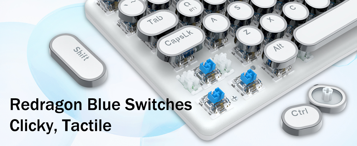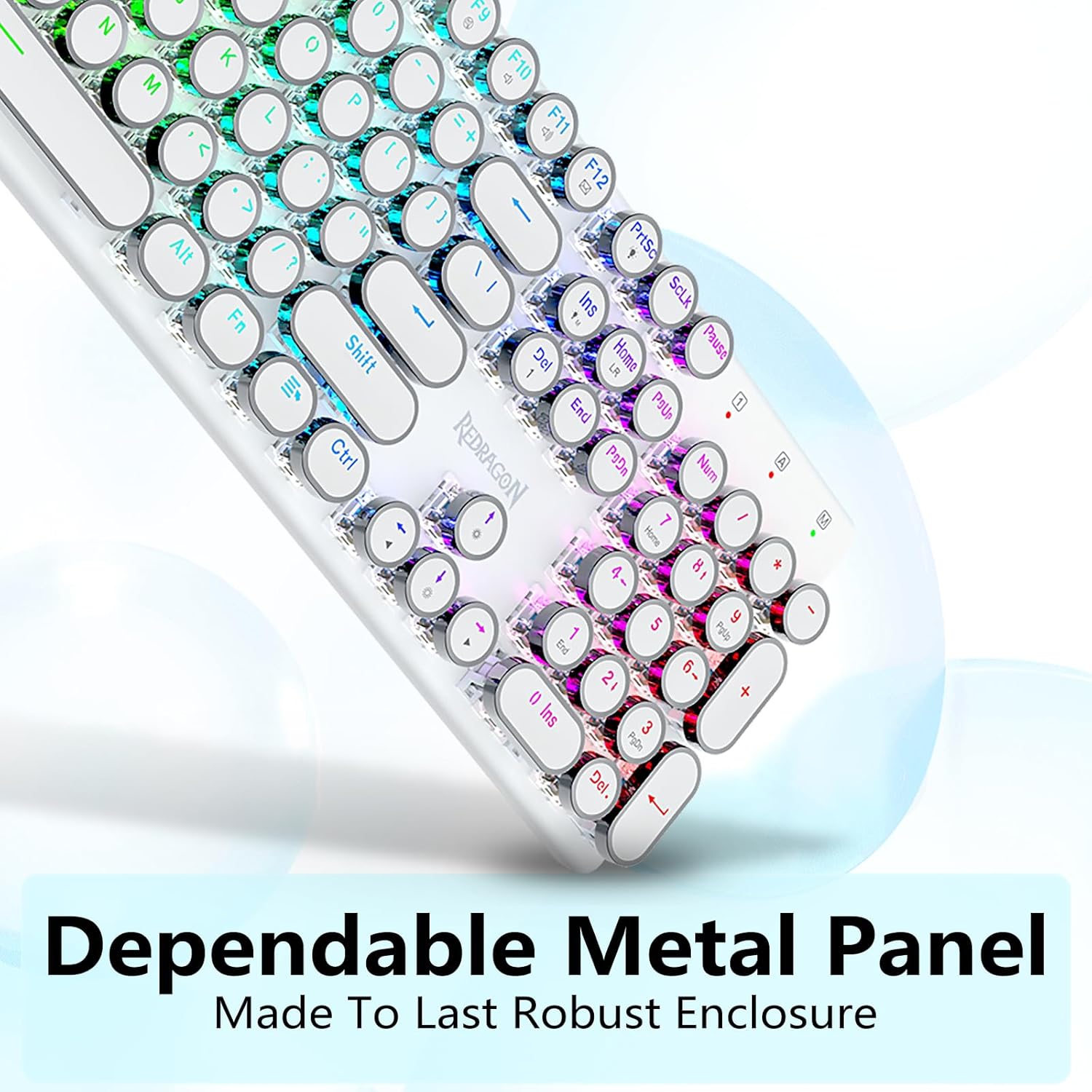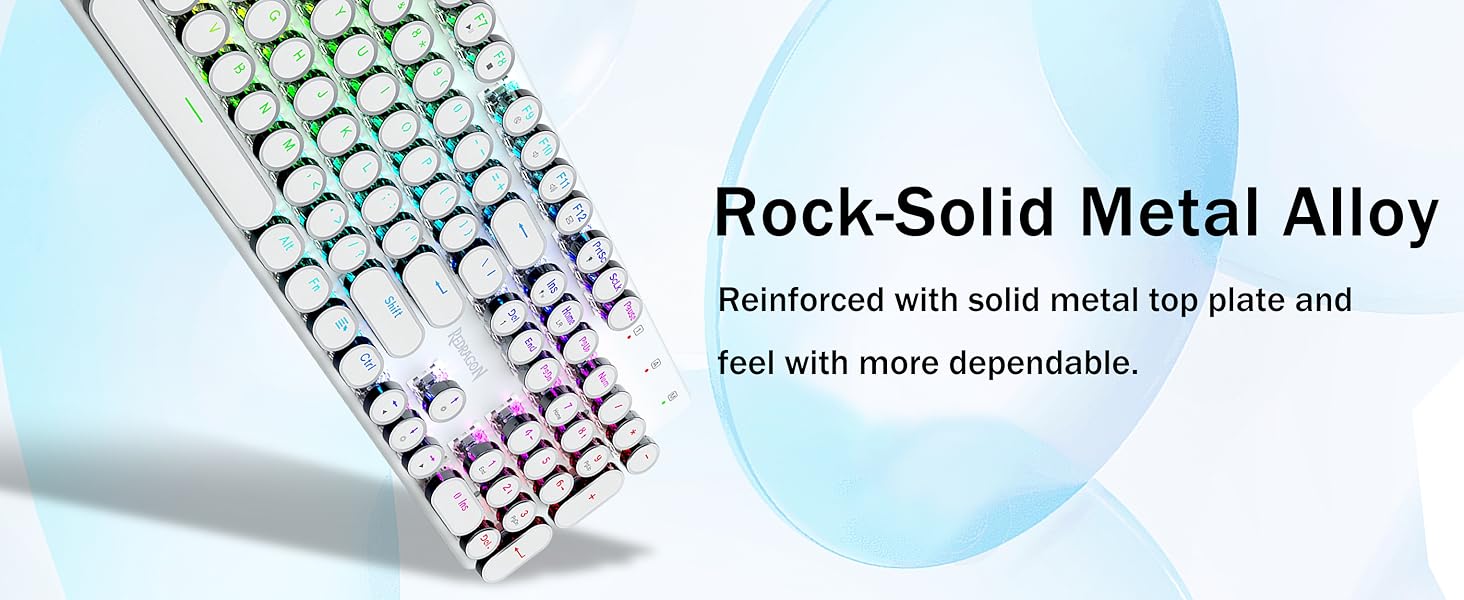 𝗗𝗲𝗽𝗲𝗻𝗱𝗮𝗯𝗹𝗲 𝗠𝗲𝘁𝗮𝗹 𝗣𝗮𝗻𝗲𝗹 र 𝟭𝟬𝘞 𝗔𝗻𝘁𝗶 𝗚𝗵𝗼𝘀𝘁𝗶𝗻𝗴- रेड्रागन मेकानिकल नीलो स्विचहरूले मध्यम प्रतिरोध, श्रव्य क्लिक ध्वनि र स्पर्श प्रतिक्रिया प्रदान गर्दछ, प्रतिक्रियाशील र सटीक गेमिङ वातावरण र प्रदर्शन प्रदान गर्दछ। भिन्टेज स्टीम्पंक किबोर्ड राउन्ड किक्यापहरू क्लासिकल टाइपराइटर जस्तै देखिन्छन्, यसले तपाईंलाई सहज टाइपिङ भावना र स्थिर क्लिक टच ल्याउँछ।