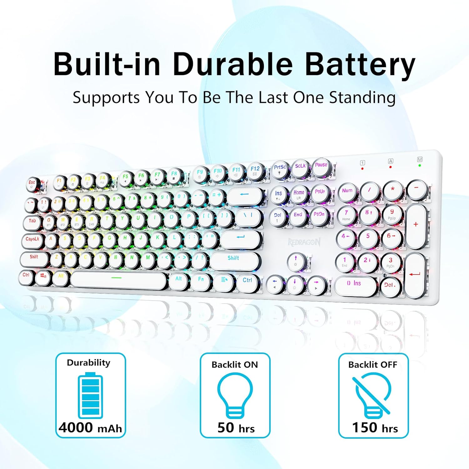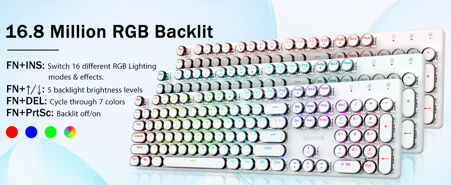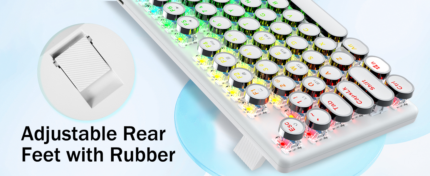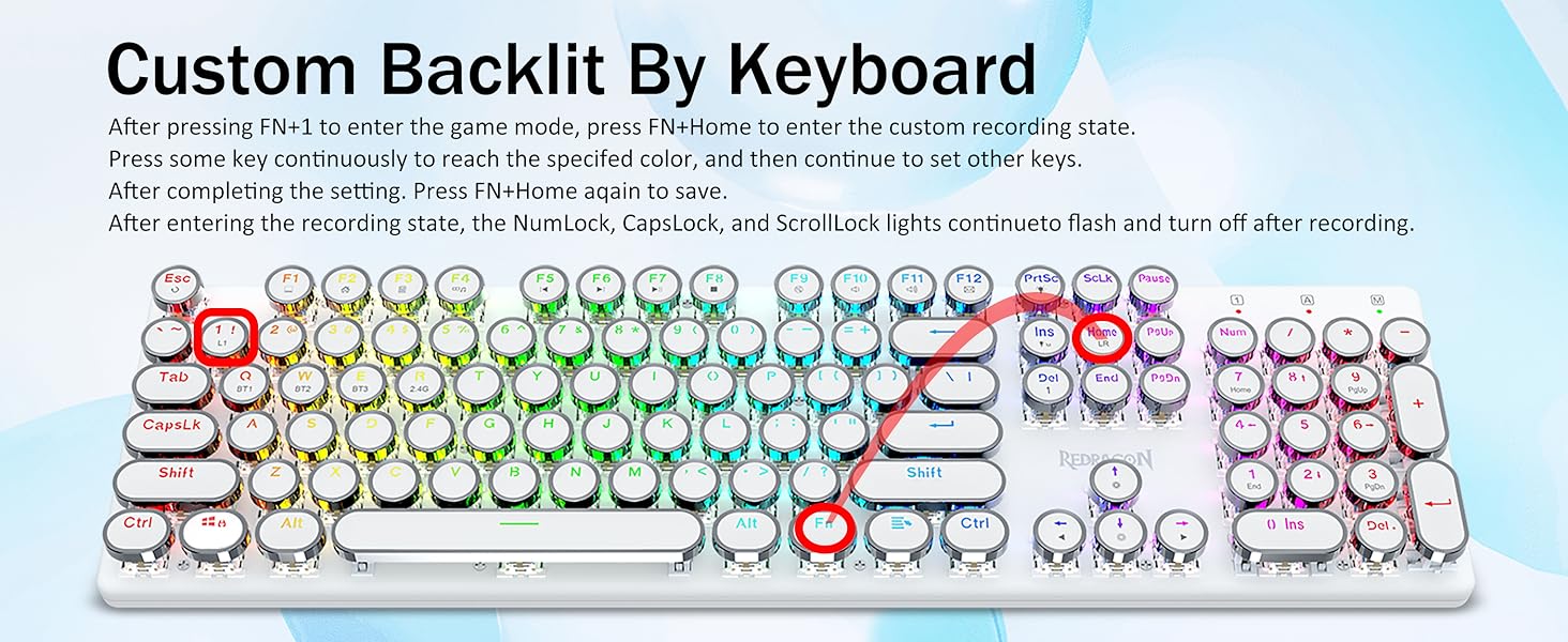 𝗗𝗲𝗽𝗲𝗻𝗱𝗮𝗯𝗹𝗲 𝗠𝗲𝘁𝗮𝗹 𝗣𝗮𝗻𝗲𝗹 र 𝟭𝟬𝘞 𝗔𝗻𝘁𝗶 𝗚𝗵𝗼𝘀𝘁𝗶𝗻𝗴- रेड्रागन मेकानिकल नीलो स्विचहरूले मध्यम प्रतिरोध, श्रव्य क्लिक ध्वनि र स्पर्श प्रतिक्रिया प्रदान गर्दछ, प्रतिक्रियाशील र सटीक गेमिङ वातावरण र प्रदर्शन प्रदान गर्दछ। भिन्टेज स्टीम्पंक किबोर्ड राउन्ड किक्यापहरू क्लासिकल टाइपराइटर जस्तै देखिन्छन्, यसले तपाईंलाई सहज टाइपिङ भावना र स्थिर क्लिक टच ल्याउँछ।