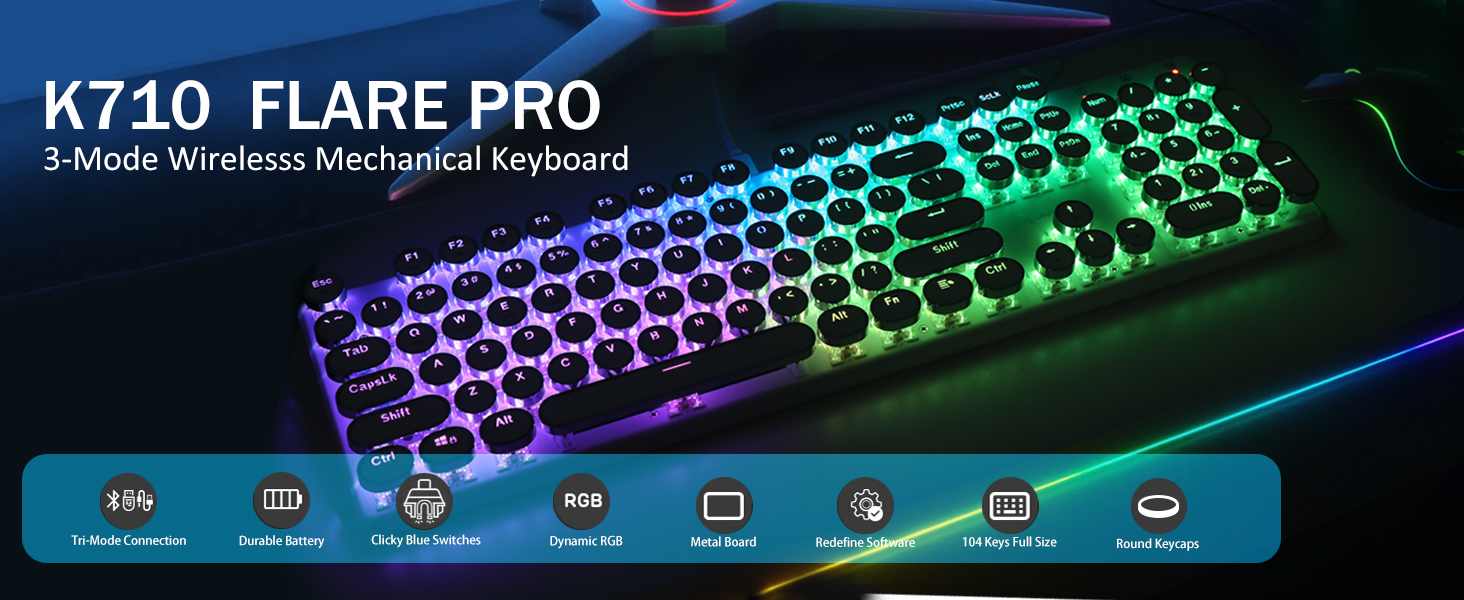 𝗗𝗲𝗽𝗲𝗻𝗱𝗮𝗯𝗹𝗲 𝗠𝗲𝘁𝗮𝗹 𝗣𝗮𝗻𝗲𝗹 र 𝟭𝟬𝘞 𝗔𝗻𝘁𝗶 𝗚𝗵𝗼𝘀𝘁𝗶𝗻𝗴- अपग्रेड गरिएको FLARE PRO संस्करणले समान ट्यांक-ठोस धातु सामग्री प्रयोग गरिरहन्छ। प्रिमियम टाइपिङ अनुभवको लागि किबोर्डलाई डेस्कमा स्थिर र सुन्दर राख्नुहोस्। K710 किबोर्डले 104-कुञ्जी एन्टी-गोस्टिङ टेक्नोलोजीलाई समर्थन गर्दछ, धेरै कुञ्जीहरूलाई एकै समयमा बिना विवाद थिच्न अनुमति दिन्छ।