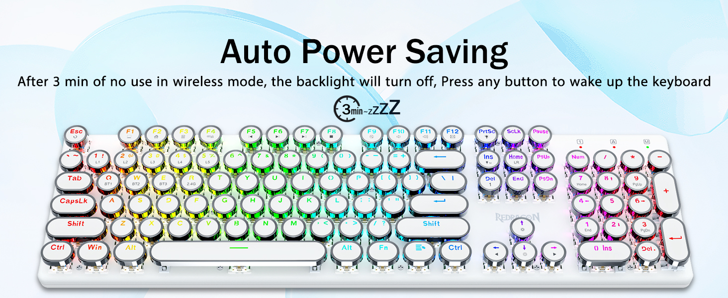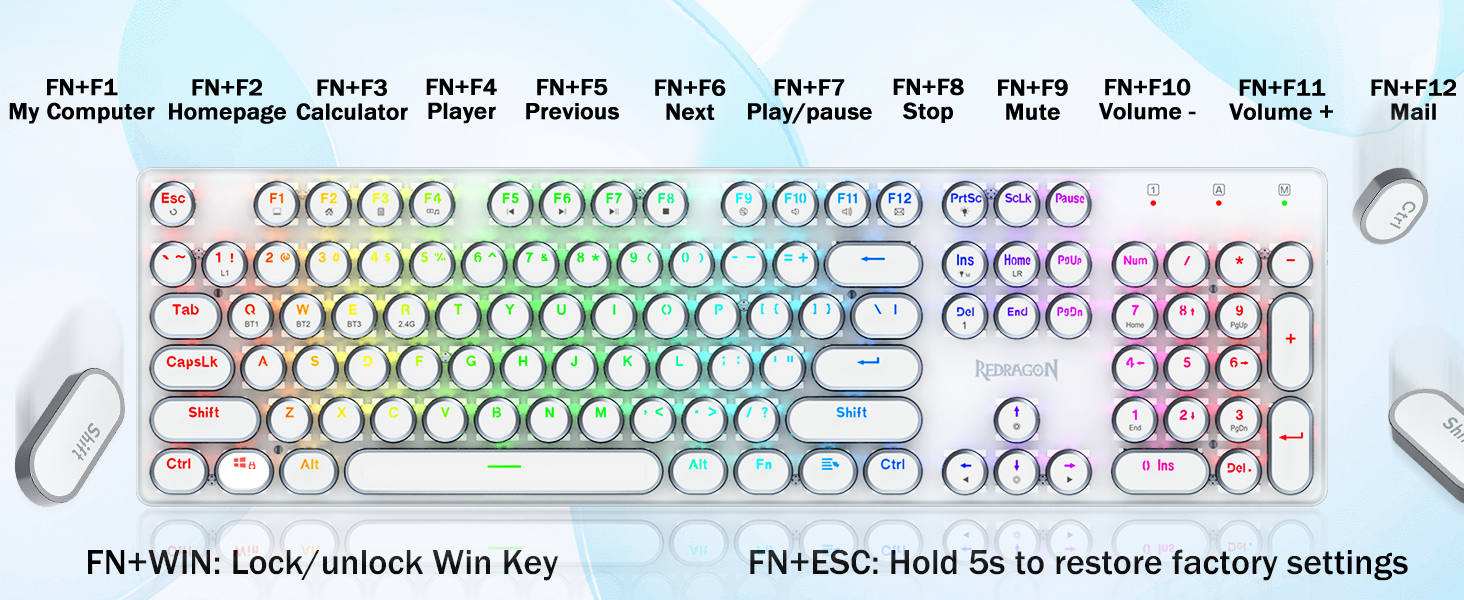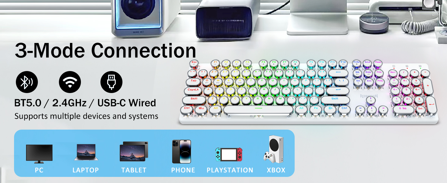 𝟯-𝗠𝗼𝗱𝗲 𝗖𝗼𝗻𝗻𝗲𝗰𝘁𝗶𝗼𝗻- Redragon अभिनव ट्राइ-मोड जडान प्रविधि, USB-C वायर्ड, ब्लुटुथ 3.0/5.0 र 2.4Ghz वायरलेस मोडहरू जसले प्रयोगकर्ता अनुभवलाई सबै क्षेत्रहरूमा अर्को स्तरमा स्तरवृद्धि गर्दछ। ब्लुटुथ मोडमा FN+Q/W/E थिच्नुहोस्, 2.4G मोडमा FN+R थिच्नुहोस्।